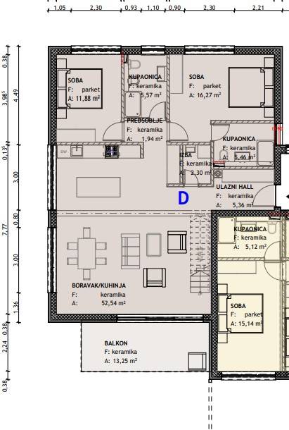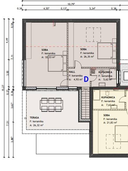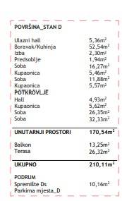 Stan D - dvoetažni stan na prvom katu sastoji se od ulaznog hodnika, spremišta, kuhinje sa dnevnim boravkom i izlazom na terasu površine 40 m2, četiri spavaće sobe te tri kupaonice. Stan ima prekrasan pogled na more i grad Rovinj!