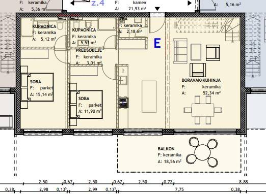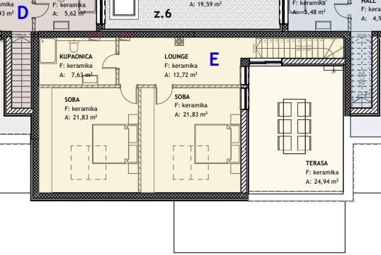 Stan E - dvoetažni stan na prvom katu sastoji se od ulaznog hodnika, spremišta, kuhinje sa dnevnim boravkom i izlazom na terasu površine 43 m2, četiri spavaće sobe te tri kupaonice. Stan ima prekrasan pogled na more i grad Rovinj!