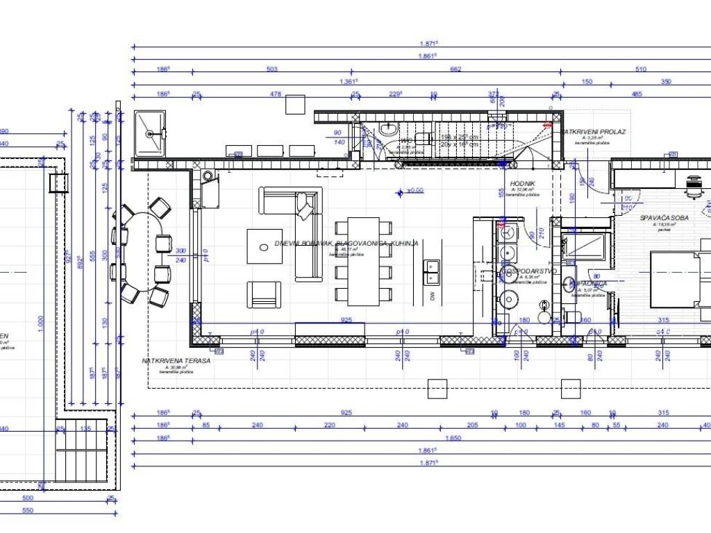 Unutar ograđenog dvorišta vila će raspolagati bazenom veličine 36,30m2 te ljetne kuhinje od 23,88m2 koja je u nastavku povezana sa vanjskim spremištem od 4,91m2.