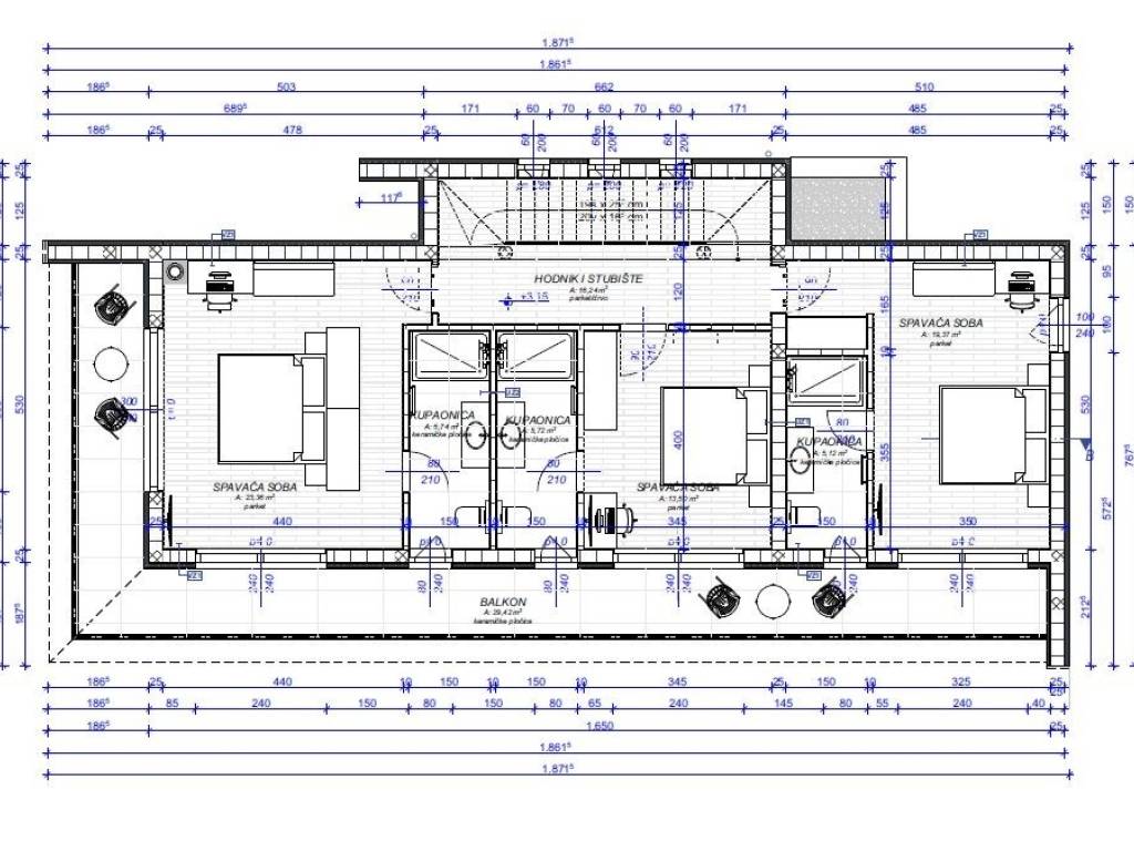 Unutarnjim stubištem pristupa se prostorijama smještenim na prvom katu, tri spavaće sobe spripadajućim kupaonicama, a iz svake sobe je moguć izlazak na balkon koji nudi pogled na okoliš.