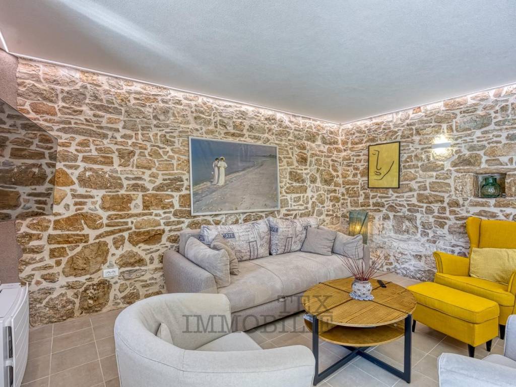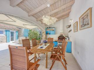 Okućnica površine 500 m² je potpuno ograđena kamenim zidom, što osigurava potpunu privatnost i mir. U središtu dvorišta smješten je bazen veličine 8x4 m, idealan za opuštanje tijekom ljetnih mjeseci.