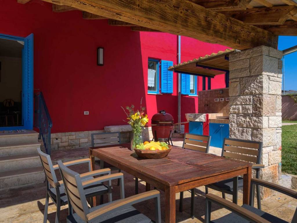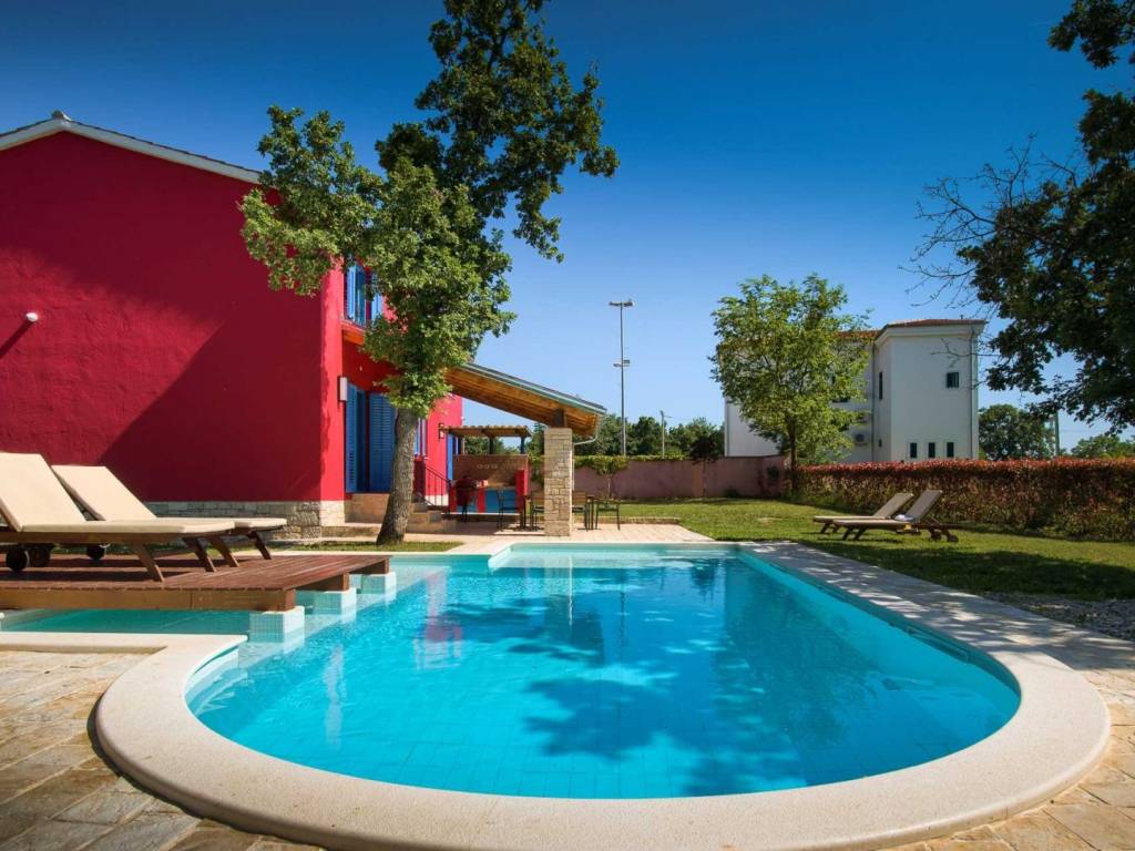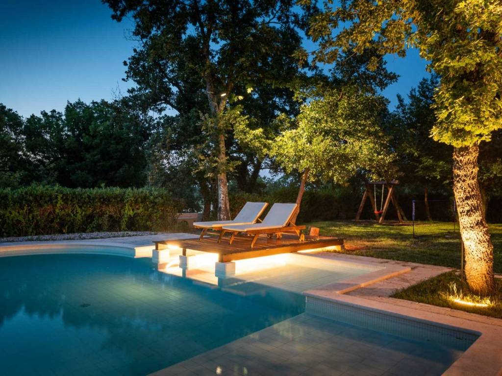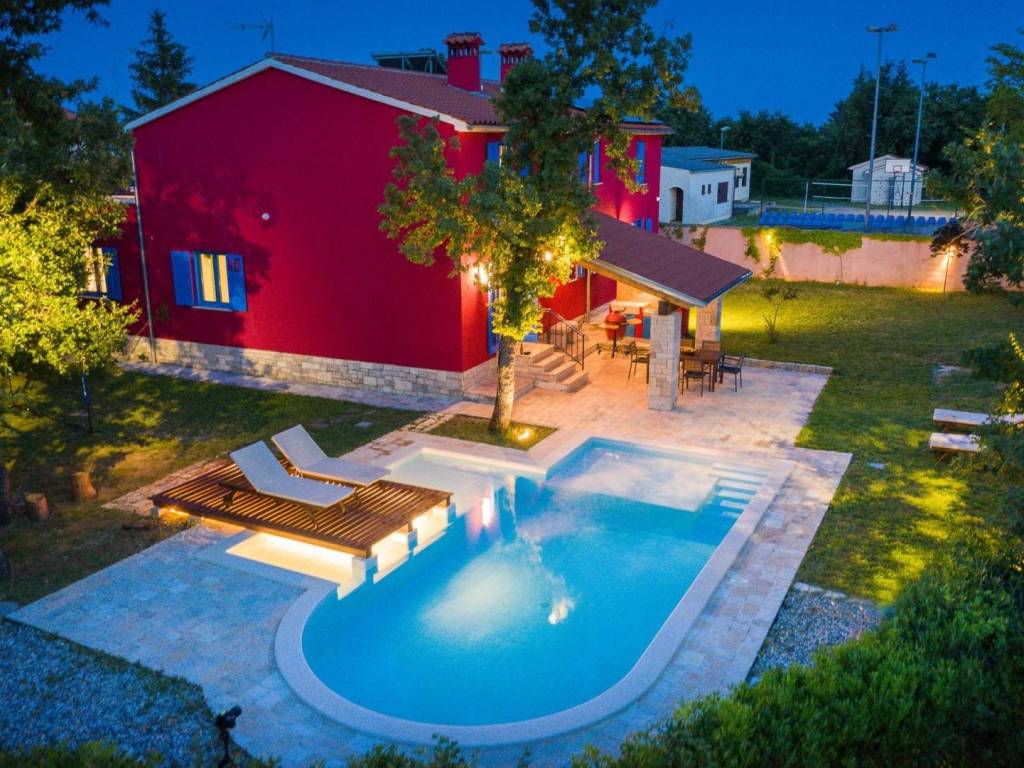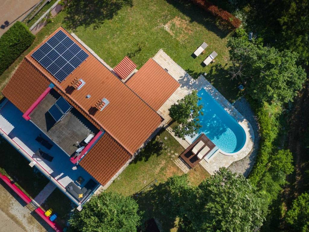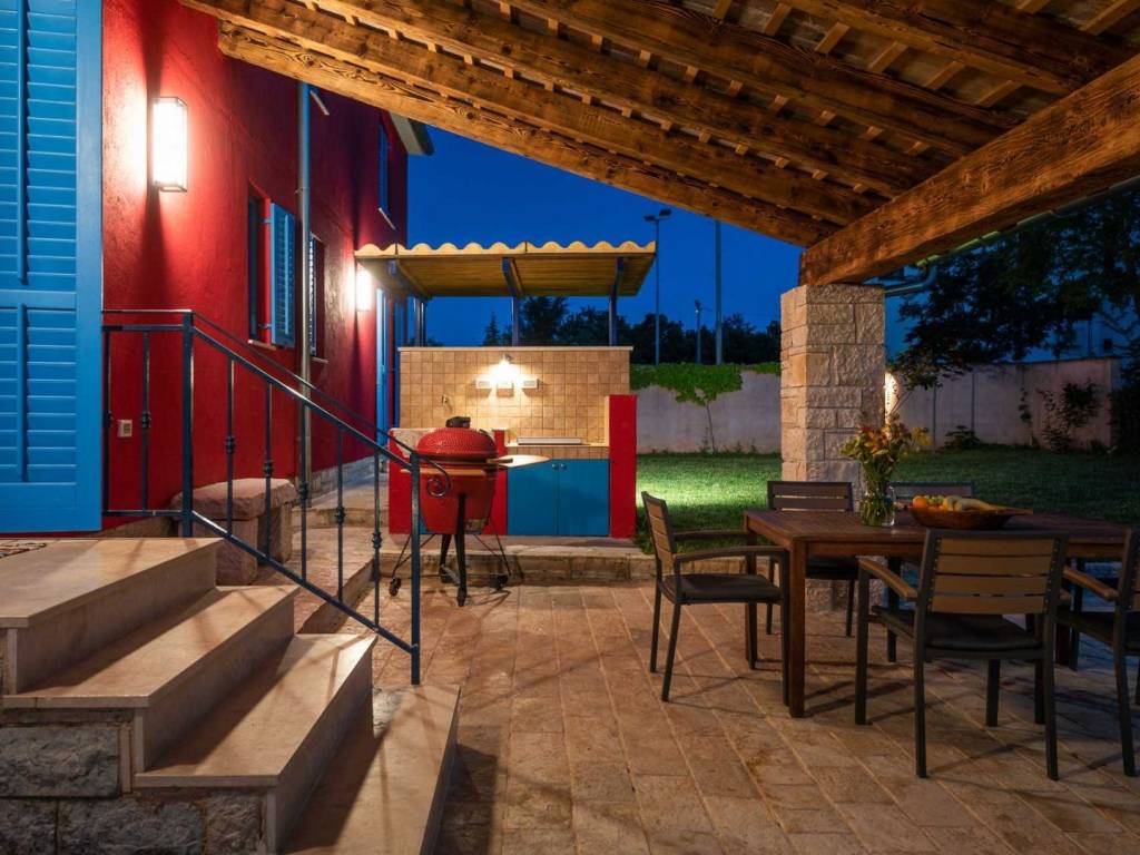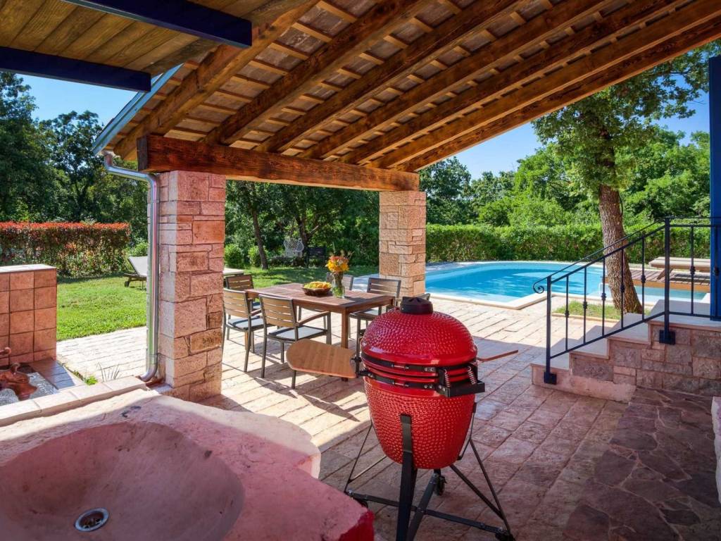Okućnica oduševljava s ljetnom kuhinjom opremljenom roštiljem, igralištem za djecu i predivnim grijanim bazenom od 34 m2.