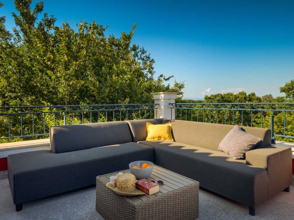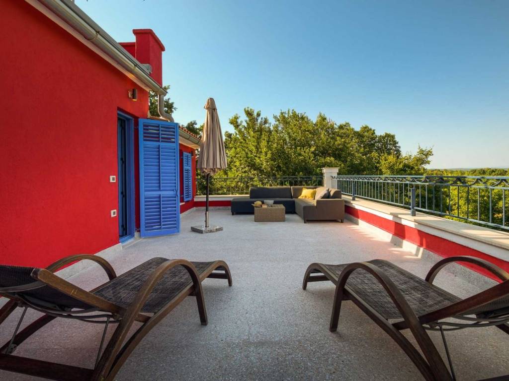 Na prvom katu nalazi se još jedna prostrana spavaća soba s vlastitom kupaonicom te dodatni prostor za druženje koji vodi do prostrane terase sa koje se pruža predivan pogled na okolnu prirodu.