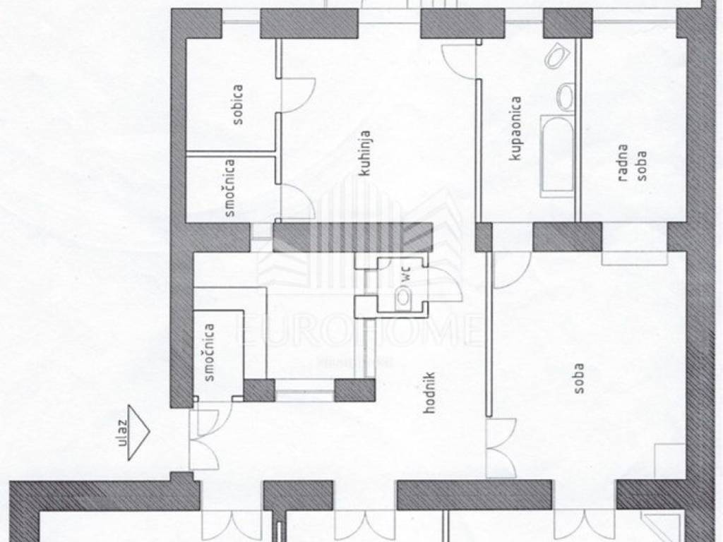Stan se nalazi u očuvanoj zgradi od tri kata, na 1.katu. Sastoji se od: -kuhinja sa blagavaonicom -kupaonica -WC -3 velike sobe -smočnica -balkon - velika terasa