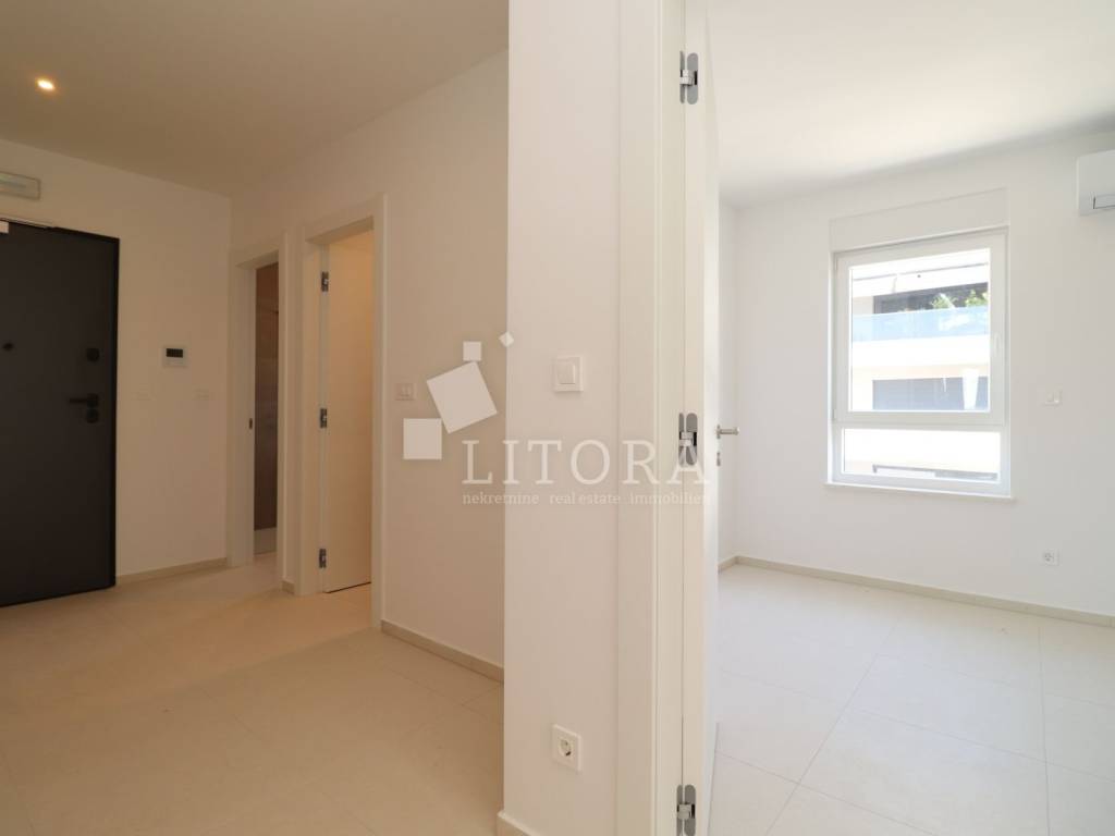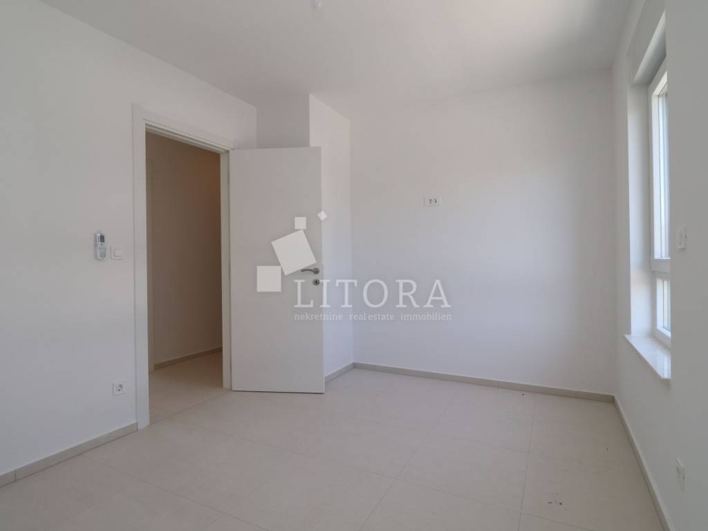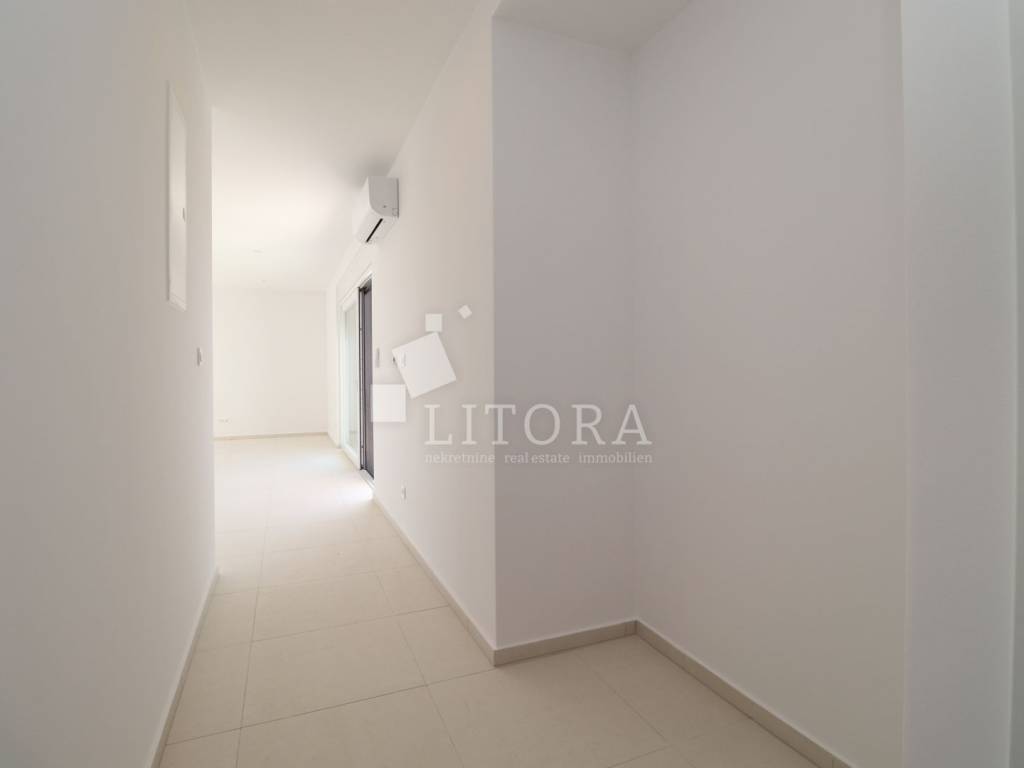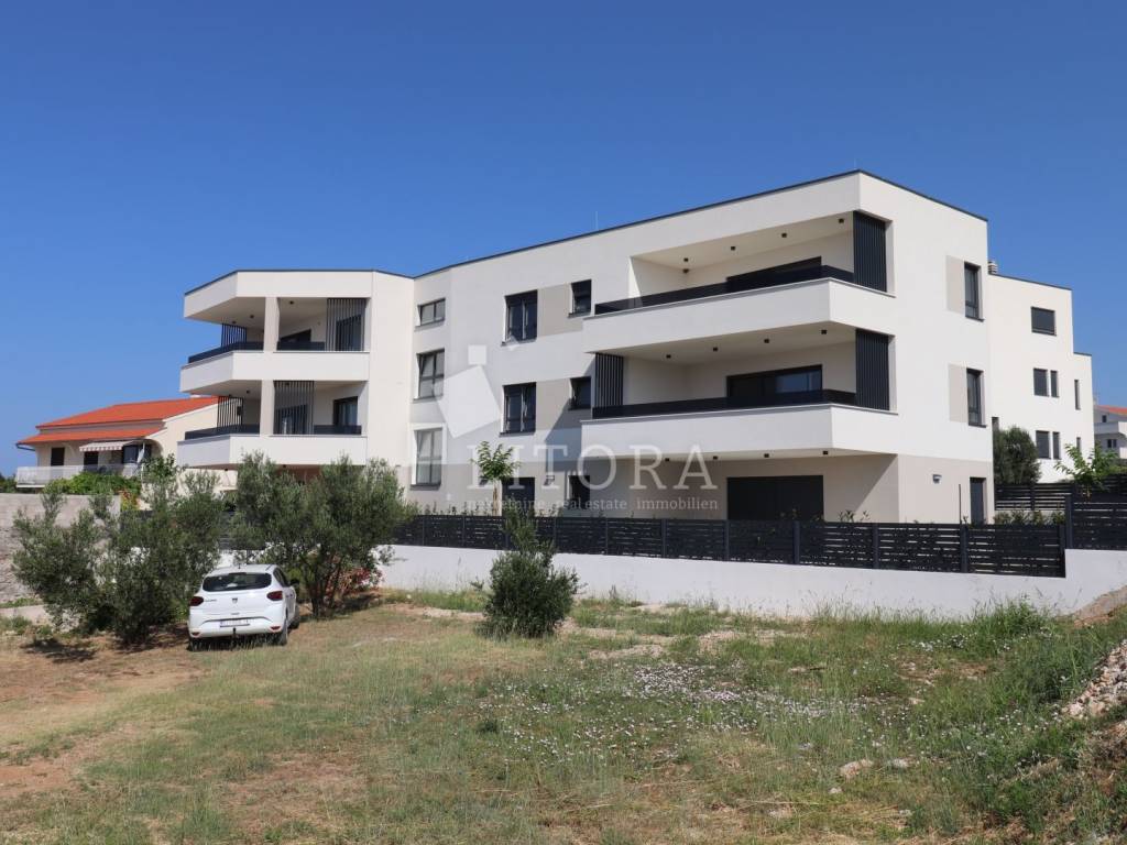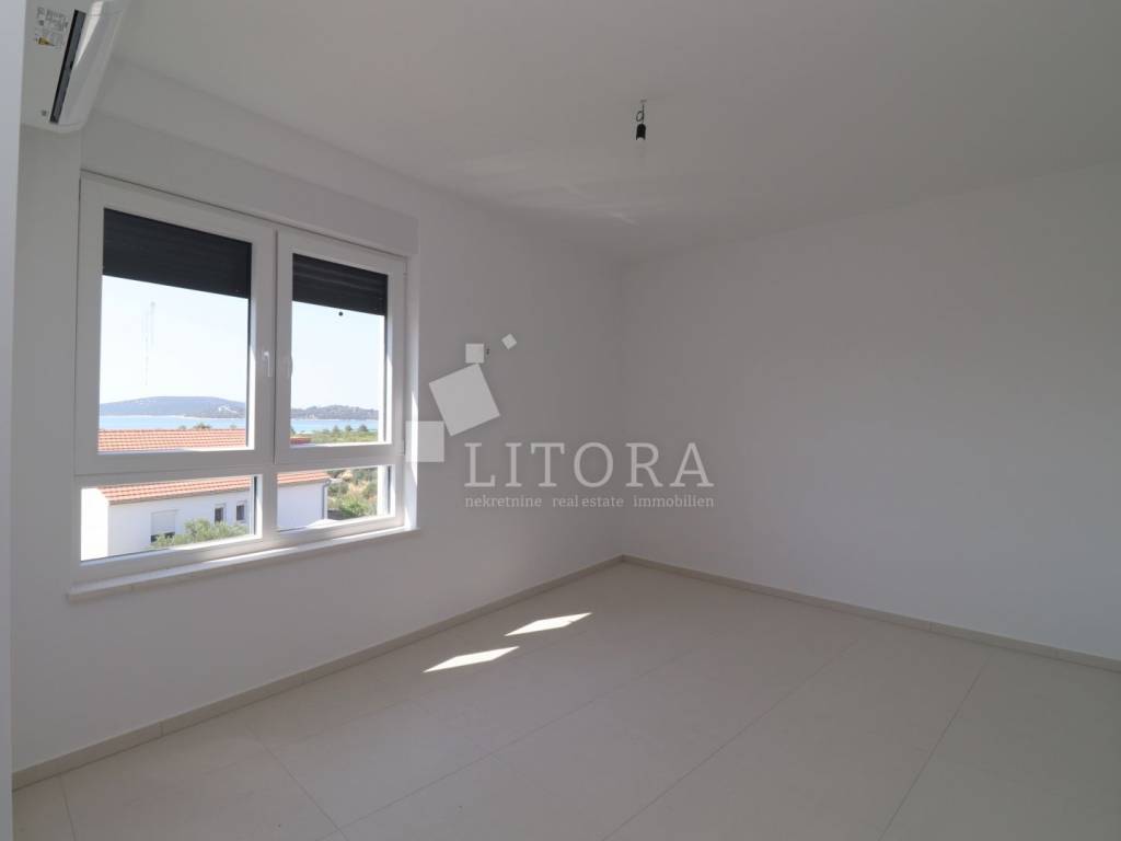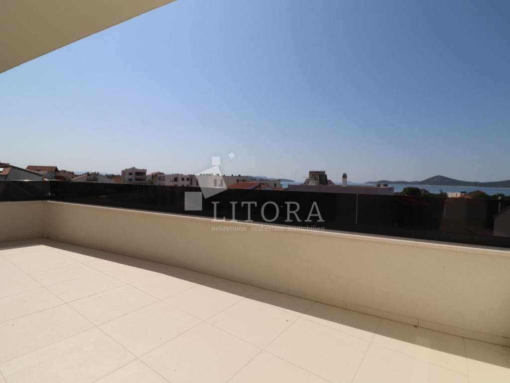 Vodice – novogradnja, 2-soban apartman ukupne korisne površine 90,62 m2, smješten na 2.katu stambene zgrade. Orijentiran je na južnu stranu a sastoji se od hodnika, 2 spavaće sobe (od kojih jedna soba ima vlastitu kupaonicu), kupaonice, vešeraja, dnevnog boravka s blagovaonicom i kuhinjom, s izlazom na natkrivenu terasu površine 20,57 m² sa pogledom na more. Odmah useljiv, opremljen je protuprovalnim vratima, klima-uređajima u svakoj prostoriji, električnim podizačima roleta, komarnicima, podnim grijanjem u kupaonicama i dnevnom boravku.