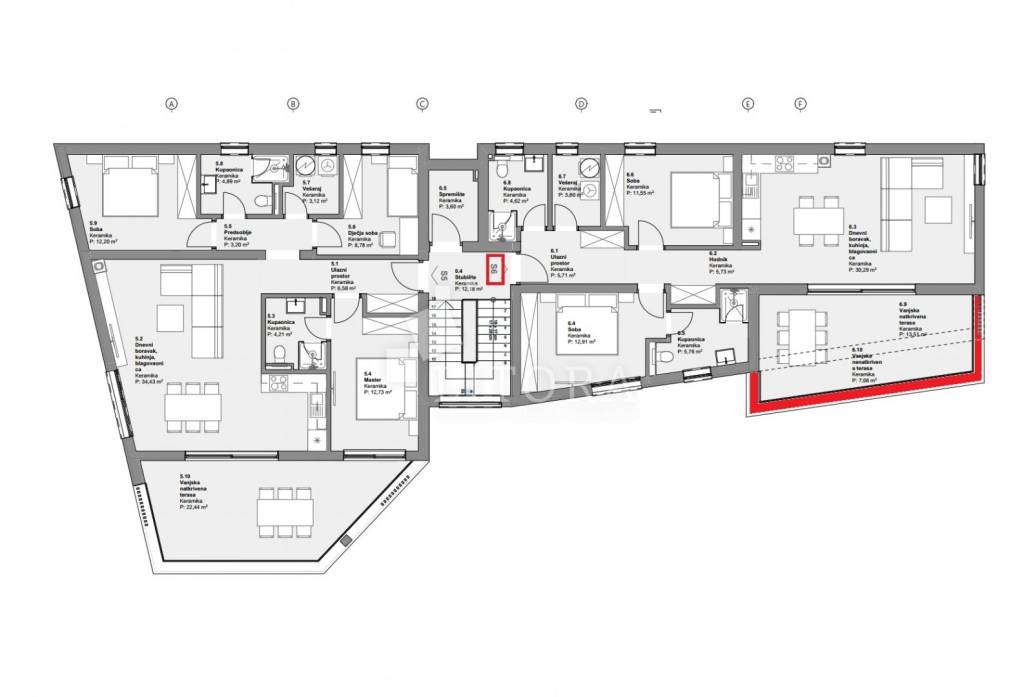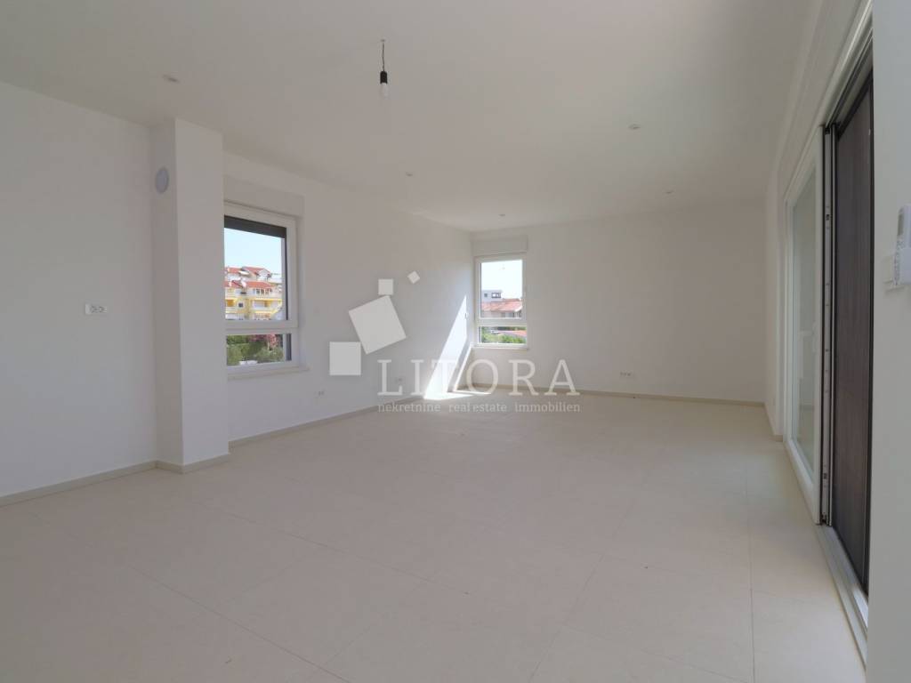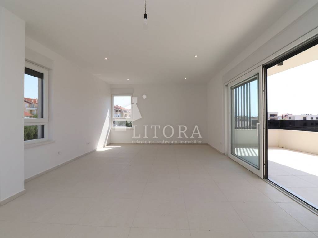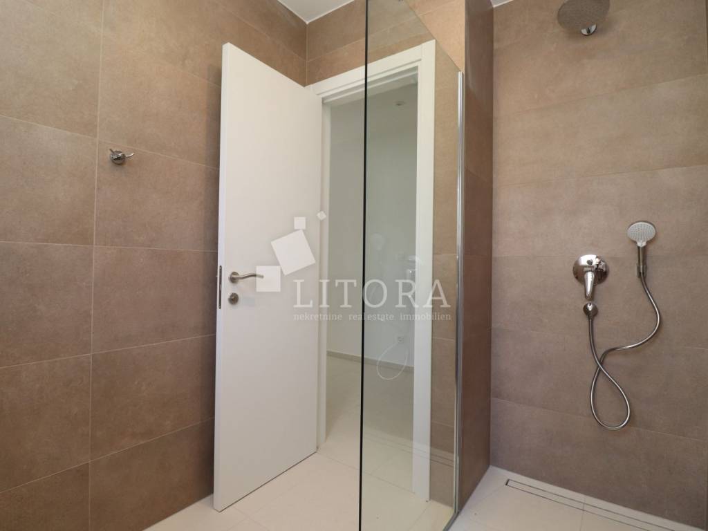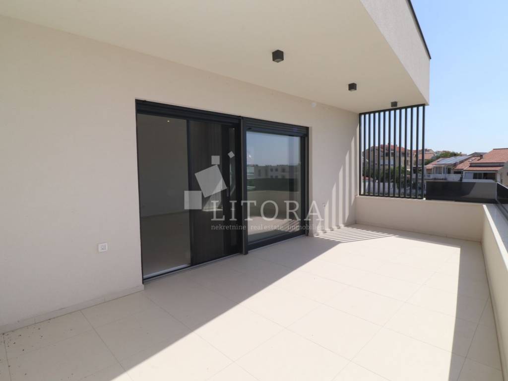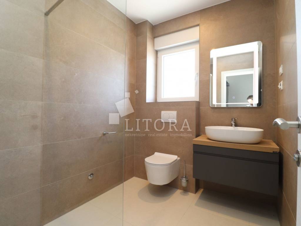 Vodice – novogradnja, 2-soban apartman ukupne korisne površine 90,62 m2, smješten na 2.katu stambene zgrade. Orijentiran je na južnu stranu a sastoji se od hodnika, 2 spavaće sobe (od kojih jedna soba ima vlastitu kupaonicu), kupaonice, vešeraja, dnevnog boravka s blagovaonicom i kuhinjom, s izlazom na natkrivenu terasu površine 20,57 m² sa pogledom na more. Odmah useljiv, opremljen je protuprovalnim vratima, klima-uređajima u svakoj prostoriji, električnim podizačima roleta, komarnicima, podnim grijanjem u kupaonicama i dnevnom boravku.