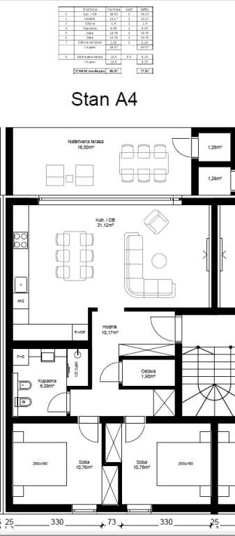 Unutar stana nalazi se ulazni hodnik, dvije spavaće sobe, kupaonica, kuhinja i dnevni boravak, terasa. Prostor dnevnog boravka obiluje velikim staklenim stijenama koje omogućavaju pristup natkrivenoj terasi s lijepim pogledom na prirodu i borovu šumu. Podovi u cijelom stanu će biti obloženi keramičkim pločicama (prema želji kupaca) ili laminatom.PVC stolarija i električne rolete pridonose modernom dojmu stana, dok su protupožarna/protuprovalna vrata dodatni element sigurnosti.