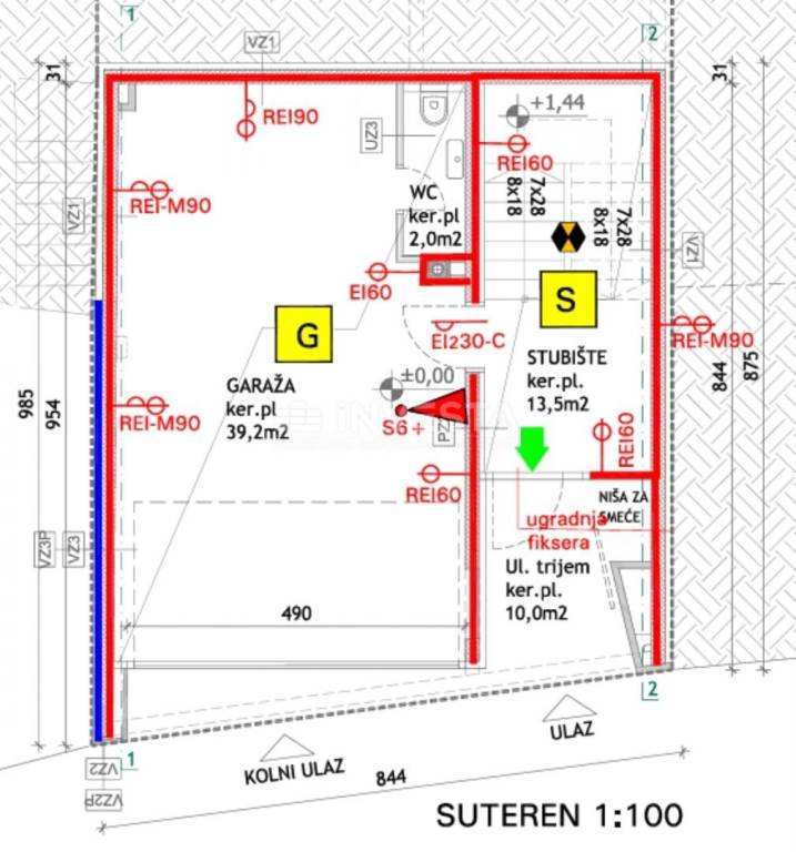 U prizemlju se nalazi ulični ulaz u zgradu i ulaz u garažu za dva vozila. Ova etaža je površine 65 m², a na njoj se nalaze i vešeraj, mali WC te kotlovnica sa bojlerom 250 l za grijanje tople vode putem dizalice topline za potrebe cijele zgrade.