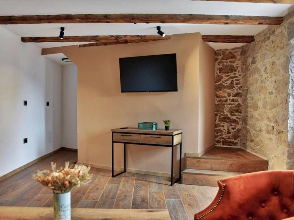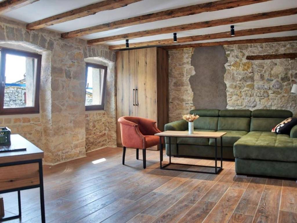 Na prodaju imamo potpuno renoviranu staru kamenu kuću, zadnja u nizu u blizini Vižinade. Ukupna stambena površina iznosi 81 m2, raspodijeljeno na tri etaže. (3x27 m2) U prizemlju se nalazi kuhinja i blagovaonski dio, te kupaonica. Na prvoj etaži se nalazi se dnevni boravak, a na drugoj etaži se nalazi spavaća soba. Postavljena PVC stolarija iznutra, te stare restaurirane drvene škure s vanjske strane, svaka etaža ima svoj klima uređaj. Površina terase ispred kuće: 13 m2. Kuća se prodaje kompletno opremljena i spremna za stanovanje ili najam. Lokacija mirna, a u blizini turističkih destinacija.
