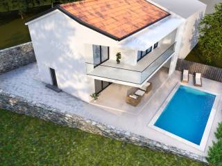 Prodaje se nova dvojna kuća kvalitetne gradnje. Kuća se prostire na dvije etaže, prizemlje i kat. U prizemlju se nalazi hodnik, toalet, spavaća soba s vlastitom kupaonom te veliki open space sa kuhinjom, blagovaonom i dnevnim boravkom iz kojih se izlazi na prostranu terasu s okućnicom i bazenom s koje se pruža pogled na more. Unutarnje stepenice vode na kat na kojem se nalaze još tri spavaće sobe svaka s vlastitom kupaonom te manji dnevni boravak s izlazom na terasu sa koje se također pruža pogled na more. Na okućnici se nalazi parking za dva vozila. U gradnji i opremanju nekretnine korišteni su vrhunski materijali koje investitor tijekom svojeg dugogodišnjeg iskustva koristi u gradnji. Nekretnina će biti opremljena alu-pvc vanjskom stolarijom, sustavom podnog grijanja, u spavaćim sobama biti će postavljen parket, dok će ostale prostorije biti obložene kvalitetnom keramikom. Nekretnina je trenutno u izgradnji, a planirani završetak gradnje je proljeće 2025.godine.