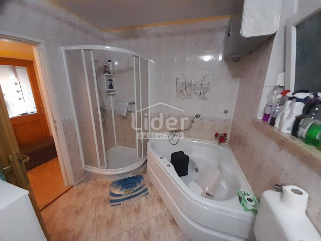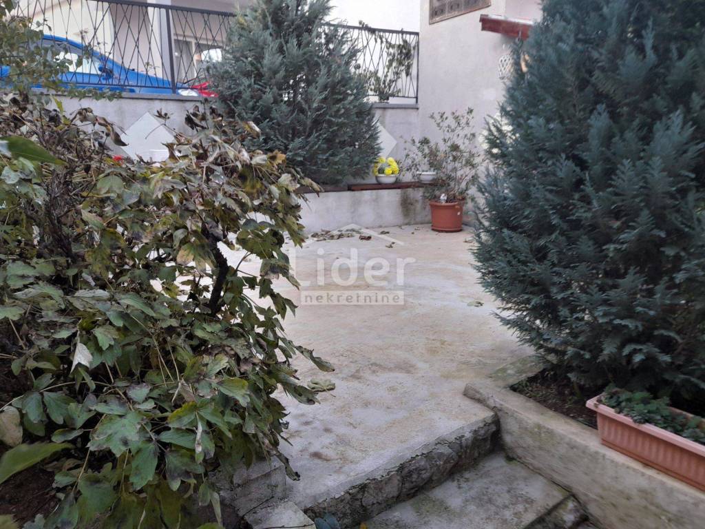 U prizemlju je stan koji se sastoji od komotnog ulaznog prostora koji je u principu zatvorena veranda, vešeraj, hodnika, kuhinje s blagovaonicom, dnevni boravak iz kojeg se izlazi na veliku terasu cca 30m2, dvije spavaće sobe, prostranog kupatila te odvojeni wc.
