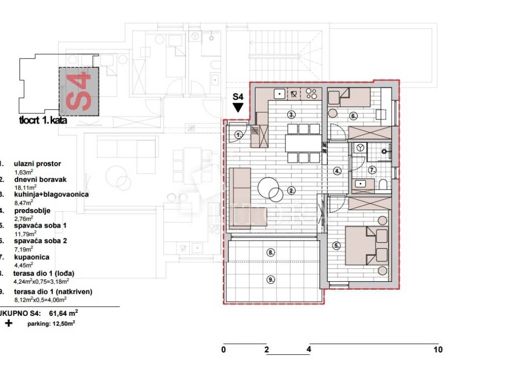 Primošten – Vrhunski opremljen apartman s prostranom terasom i panoramskim pogledom. Na mirnoj i uzdignutoj lokaciji iznad Primoštena, s prekrasnim panoramskim pogledom na more i slikovito mjesto, smješten je moderan apartman na 1.katu novogradnje – projektirane po najvišim standardima suvremenog stanovanja. Zgrada se nalazi na idealnoj poziciji: lako dostupna automobilom, u blizini svih javnih sadržaja, a istovremeno dovoljno izdvojena za potpuni mir i privatnost. Apartman ima 66,64m2 korisne površine, orijentiran je prema jugoistoku. Sastoji se od moderne kupaonice, dvije udobne spavaće sobe te dnevnog dijela s izlazom na prostranu terasu površine 12,34m². Apartman je projektiran s naglaskom na kvalitetu i komfor te uključuje: podno grijanje, vrhunsku aluminijsku/PVC stolariju s komarnicima i roletama na električne podizače, podne obloge od visoko kvalitetne keramike i prvoklasnog parketa, parkirno mjesto od 12,50m2, uz mogućnost punjenja električnih ili hibridnih vozila (punionica već ugrađena). Zgrada je trenutno u fazi gradnje, a završetak i useljenje predviđeni su za ljeto 2026. godine. Udaljenost do prve plaže iznosi cca 1.250 m, a do centra Primoštena 1.800 m.