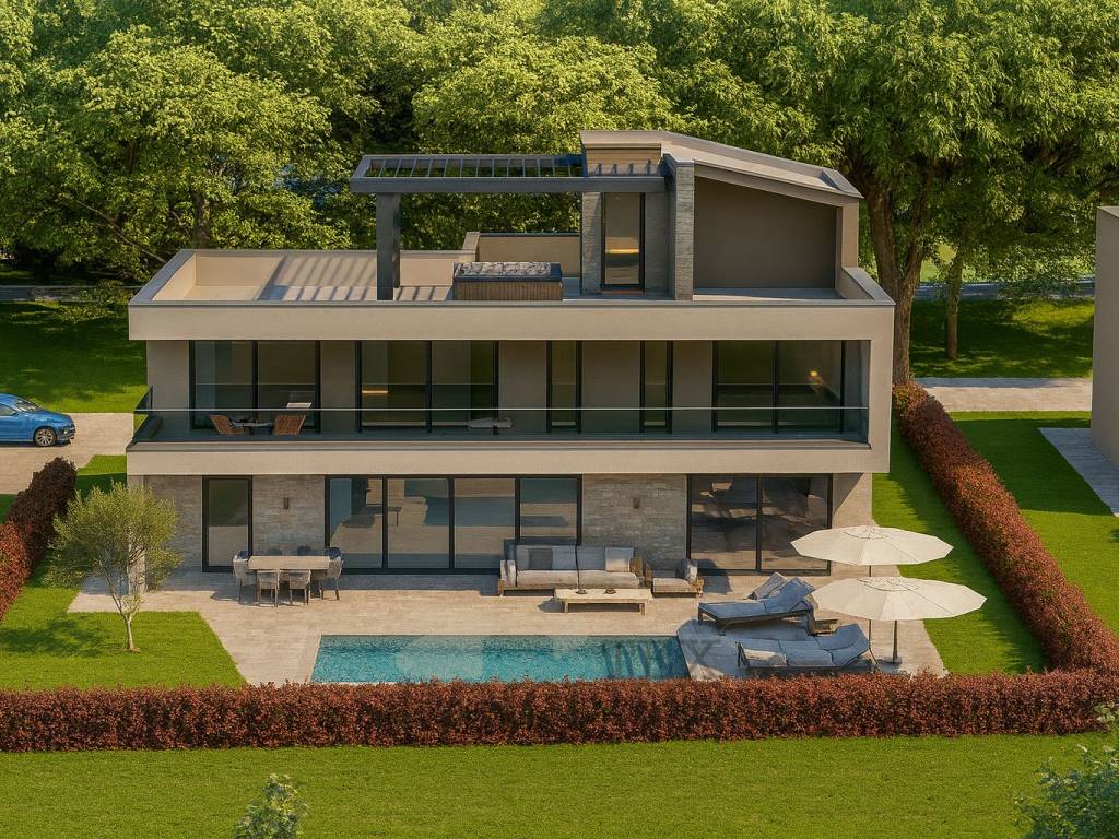Prodaje se prekrasna moderna vila u okolici Poreča i 2.7 km od mora. U prizemlju sadrži prostrani dnevni boravak,kuhinju i blagovaonicu od čak 55 m2, wellness kutak za uživanje, tehničku sobu, praonicu i wc za goste. Na prvome katu nalaze se tri en-suite spavaće sobe (sa privatnim kupaonicama) i terasa od 58m2. Na vrhu se nalazi krovna terasa od 45 m2. Vrt je ograđen, u središnjem dijelu nalazi se bazen, a oko njega sunčalište, natkrivena terasa od 55 m2 i kamin. Grijanje: podno grijanje (dizalica topline).