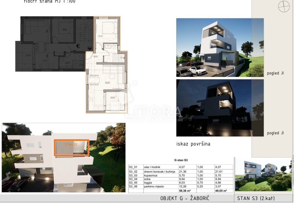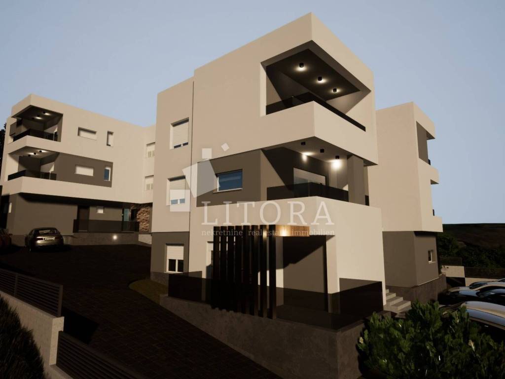 Žaborić, 450m od plaže, novoizgrađeni apartman s pogledom na more. Apartman ima 49,05m2 korisne površine, smješten u sklopu manje višestambene zgrade. Orijentiran na jugo-istočnu stranu, s pogledom na more. Sastoji se od predsoblja, kupaonice, spavaće sobe, dnevnog boravka s blagovaonicom i kuhinjom, s izlazom na natkrivenu terasu 6,03m2. Apartman je opremljen protuprovalnim vratima, klima uređajima u svakoj prostoriji, električnim podizačima roleta, komarnicima. Pripada mu jedno vanjsko parkirno mjesto. Udaljen 450 m od plaže i 450 m od centra grada.