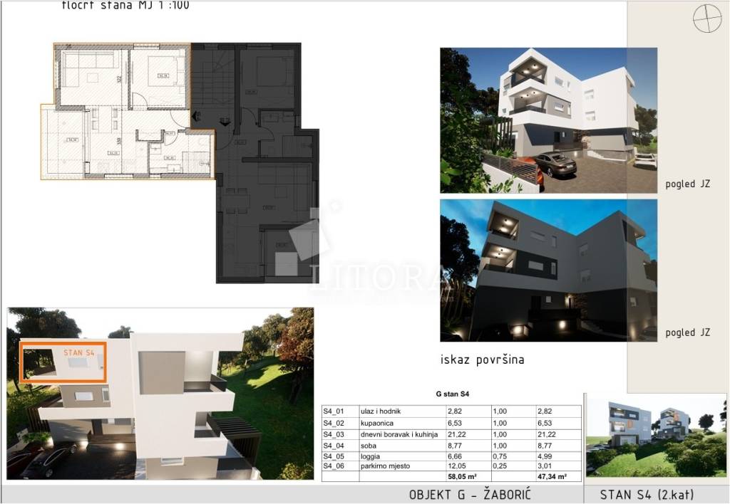 Žaborić, 450m od plaže, novoizgrađeni apartman s pogledom na more. Apartman ima 47,34m2 korisne površine, smješten u sklopu manje višestambene zgrade. Orijentiran na jugo-zapadnu stranu, s pogledom na more. Sastoji se od predsoblja, kupaonice, spavaće sobe, dnevnog boravka s blagovaonicom i kuhinjom, s izlazom na natkrivenu terasu 6,66m2. Apartman je opremljen protuprovalnim vratima, klima uređajima u svakoj prostoriji, električnim podizačima roleta, komarnicima. Pripada mu jedno vanjsko parkirno mjesto. Udaljen 450 m od plaže i 450 m od centra grada.