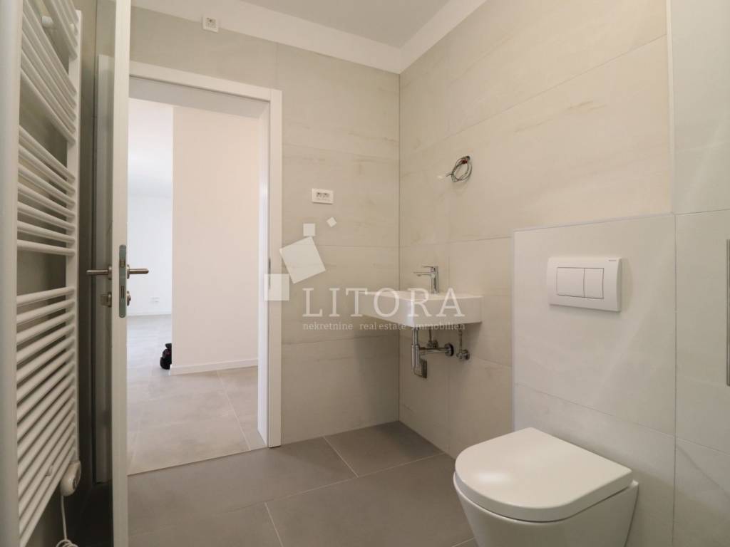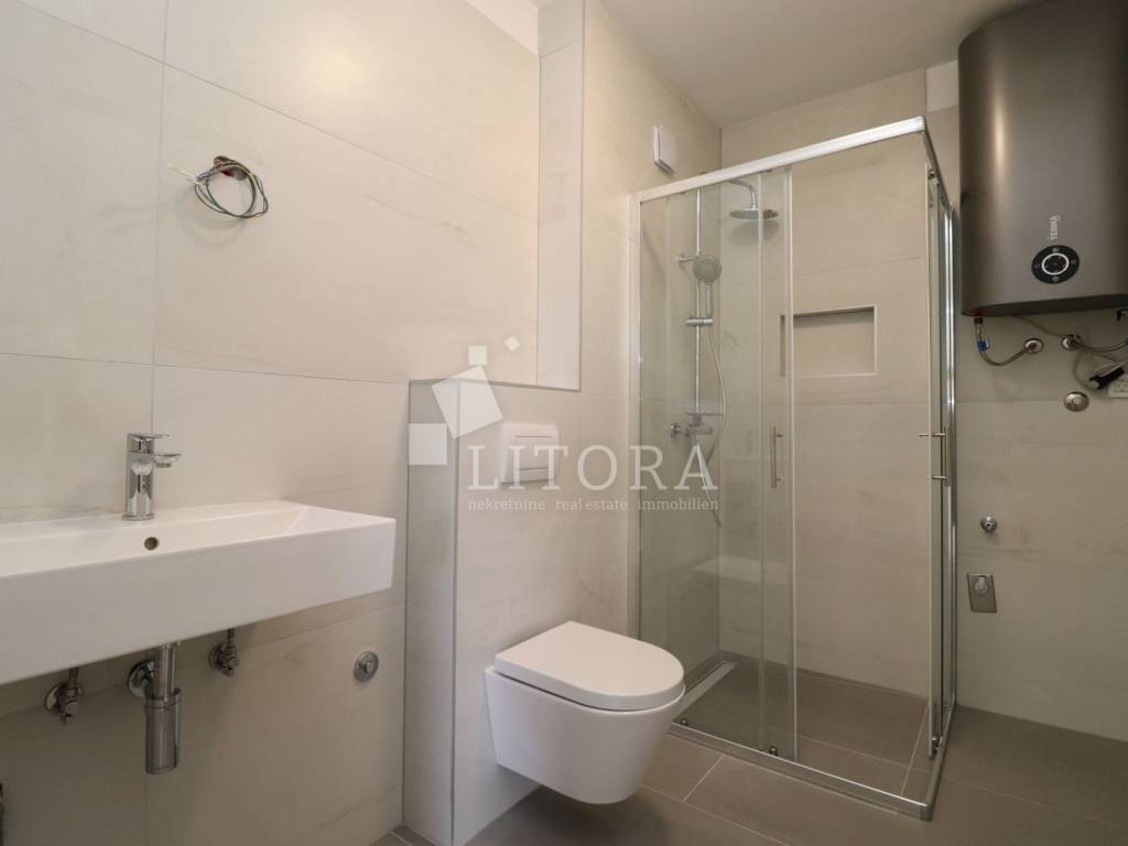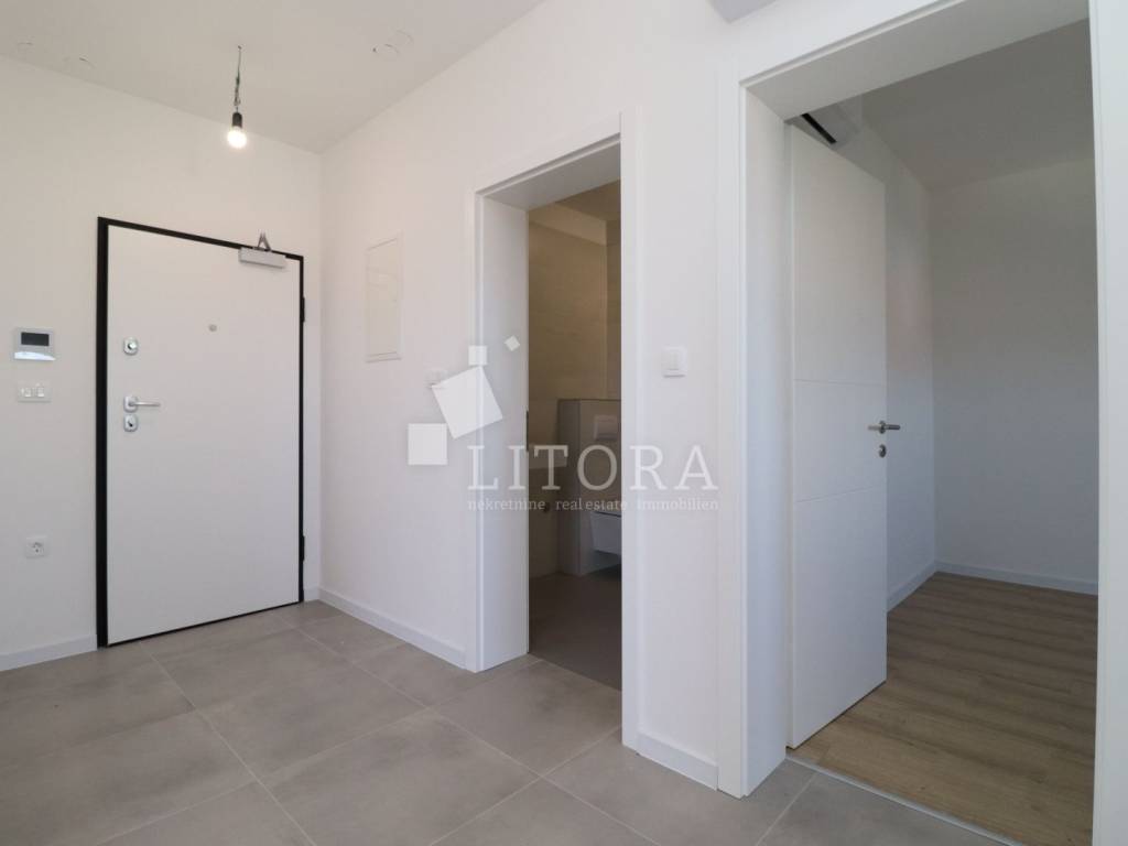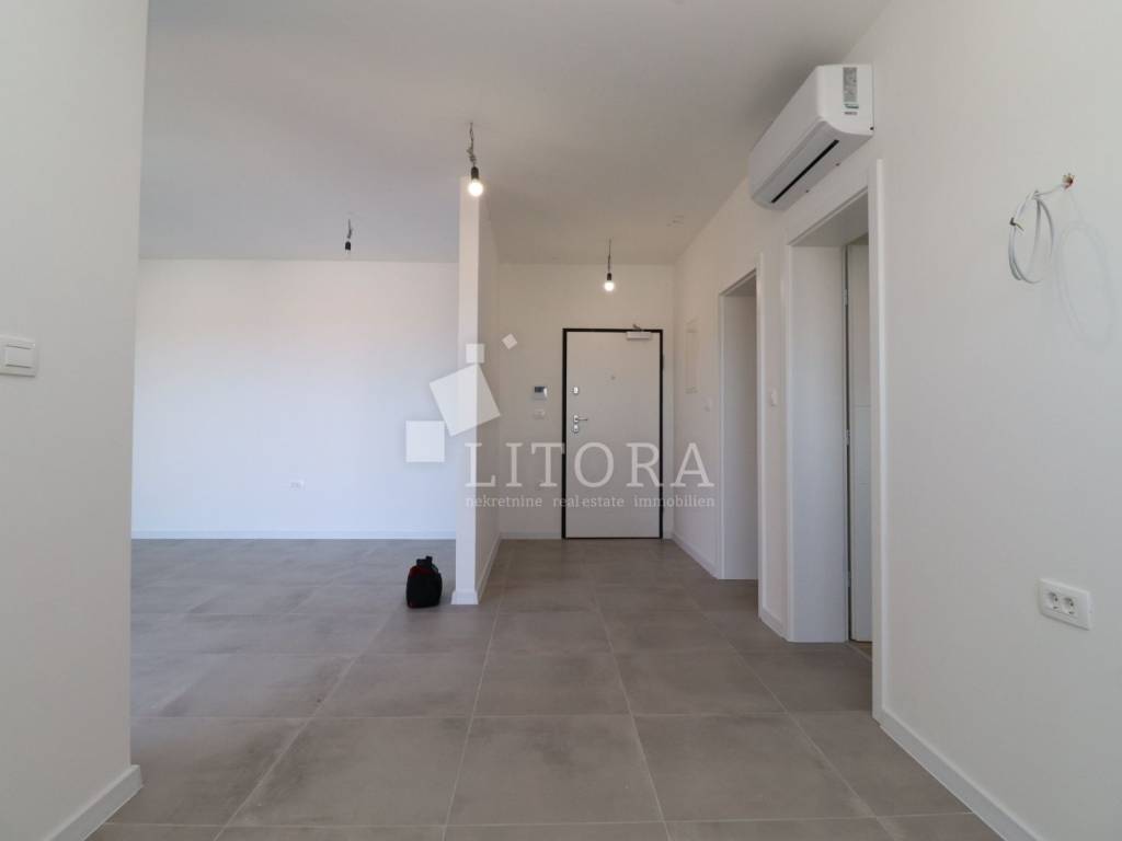 Vodice – mirno okruženje. Novoizgrađeni jednosobni apartman s terasom i pogledom na more i grad Vodice. Apartman površine 65,47 m² nalazi se na 1. katu novoizgrađene višestambene zgrade. Orijentiran je na južnu stranu, a sastoji se od predsoblja/hodnika, kupaonice, spavaće sobe s prozorom i pogledom na more, kuhinje te prostranog dnevnog boravka s izlazom na natkrivenu lođu, s koje se pruža pogled na more i grad Vodice. Apartman je odmah useljiv. Uz apartman dolazi dodatna poluotvorena prostorija (spremište) te jedno vanjsko parkirno mjesto. Opremljenost stana: Klimatizacija svih prostorija, Komarnici integrirani u prozorima s roletama, PVC stolarija proizvođača Schüco (prozori i klizne stijene), Walk-in tuš sa staklenom pregradom. Keramika i laminat prve klase. Zgrada se nalazi 1.500 m od Plave plaže i 1.100 m od centra grada.