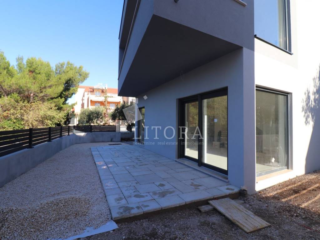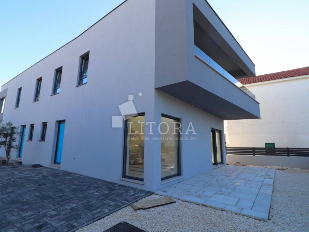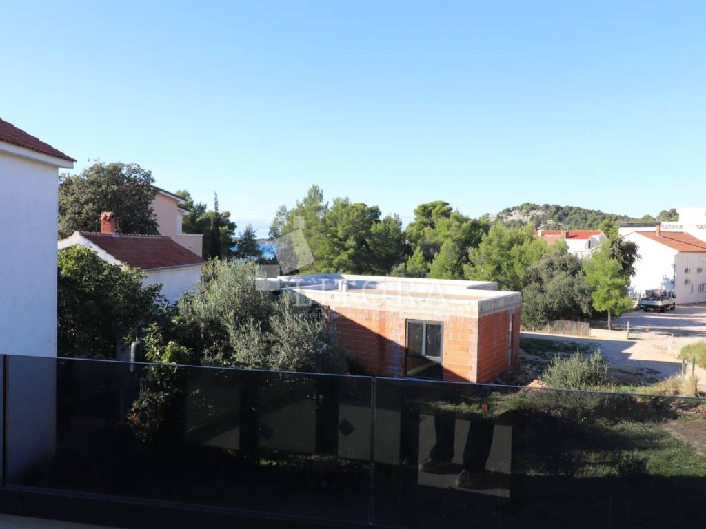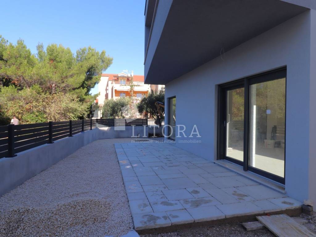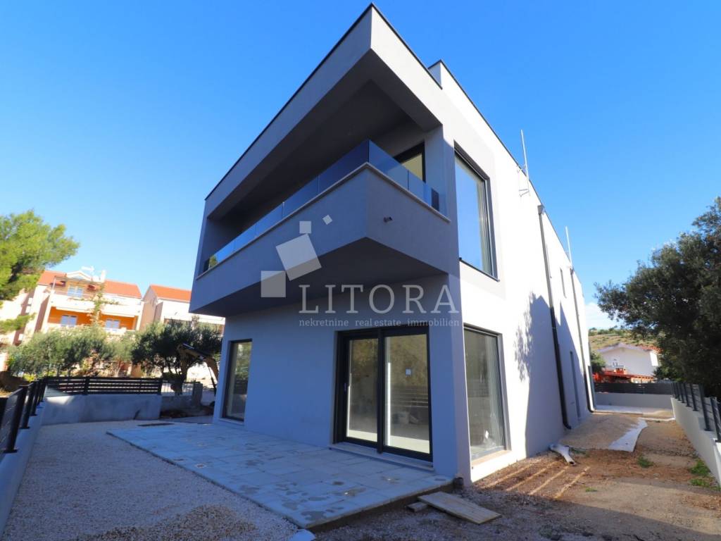 Žaborić – 3. red do mora obiteljska dvojna kuća moderne arhitekture na mirnoj lokaciji. Kuća ima dvije etaže (prizemlje + 1. kat), s ukupnom korisnom površinom od 115,08 m². Zelena površina površine 76,66 m2, velika terasa, 2 parkirna mjesta. Prizemlje se sastoji od predsoblja, spavaće sobe, kupaonice, te dnevnog boravka sa kuhinjom i blagovaonicom sa izlazom na terasu površine 11,79 m2. Unutarnje stepenice vode na 1. kat gdje se nalazi vešeraj, dvije spavaće sobe svaka sa vlastitom kupaonicom, terasa. Kuća je opremljena: visokokvalitetnim keramičkim oblogama, klima-uređaji u svim prostorijama, staklene ograde, podno grijanje u dnevnom boravku i kupaonicama. Udaljenost do plaže je 70 m, 450m do centra mjesta.