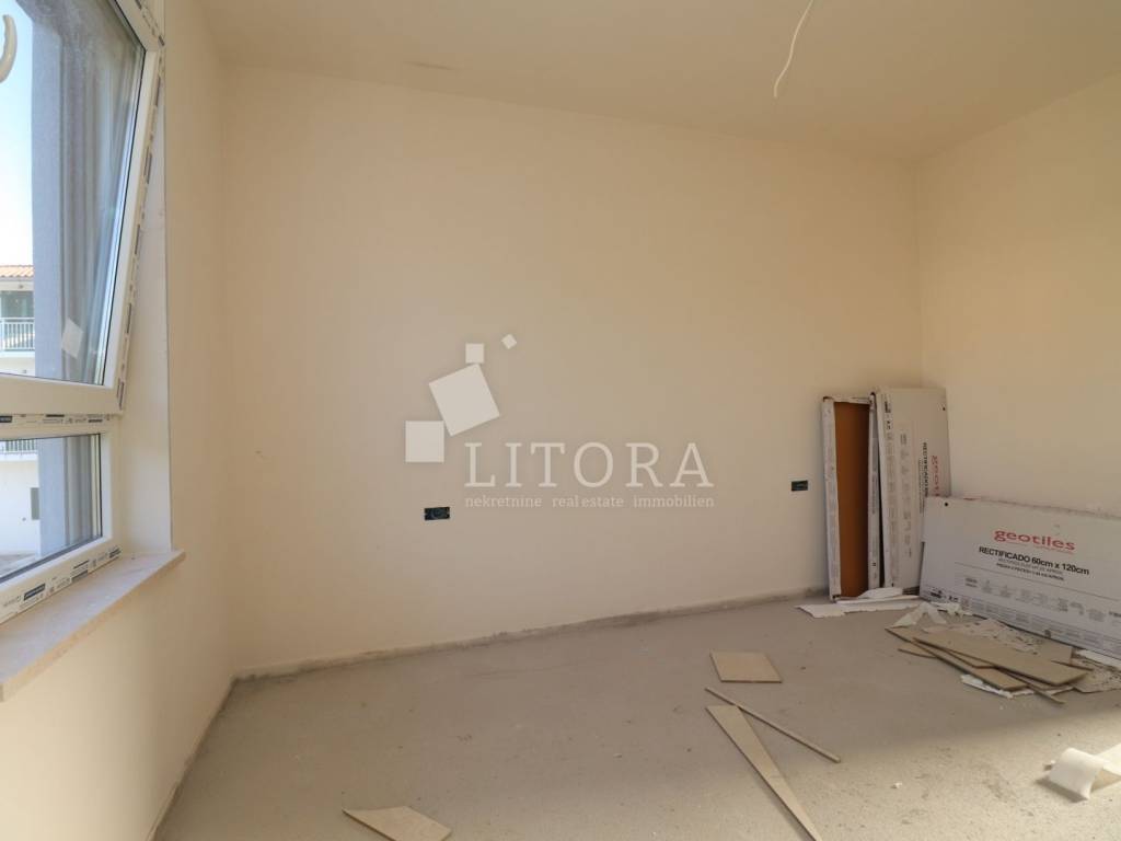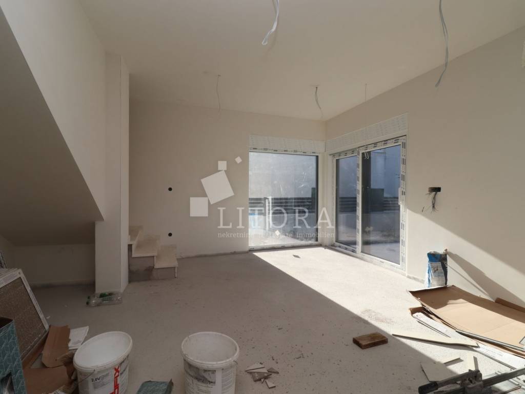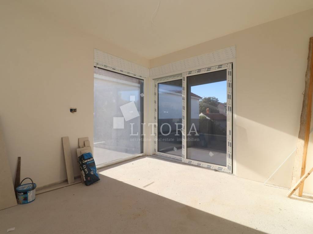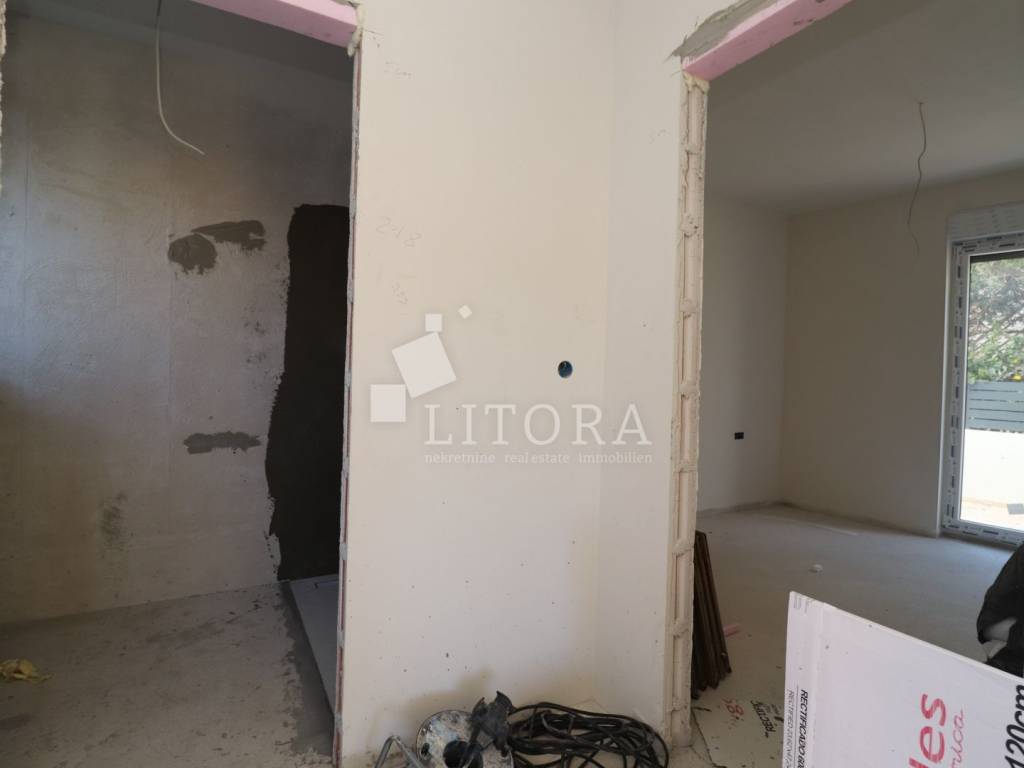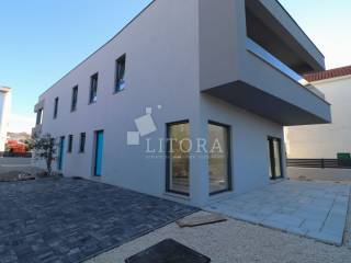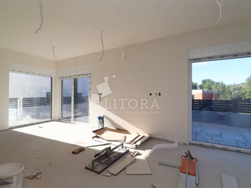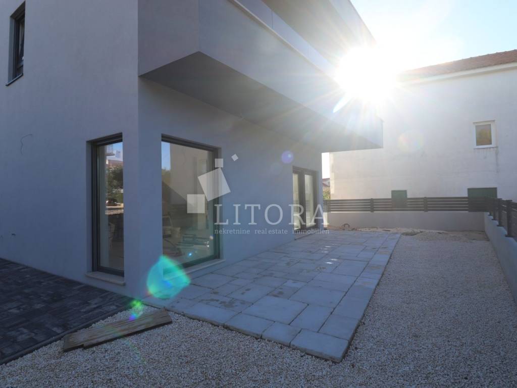 Žaborić – 3. red do mora obiteljska dvojna kuća moderne arhitekture na mirnoj lokaciji. Kuća ima dvije etaže (prizemlje + 1. kat), s ukupnom korisnom površinom od 115,08 m². Zelena površina površine 76,66 m2, velika terasa, 2 parkirna mjesta. Prizemlje se sastoji od predsoblja, spavaće sobe, kupaonice, te dnevnog boravka sa kuhinjom i blagovaonicom sa izlazom na terasu površine 11,79 m2. Unutarnje stepenice vode na 1. kat gdje se nalazi vešeraj, dvije spavaće sobe svaka sa vlastitom kupaonicom, terasa. Kuća je opremljena: visokokvalitetnim keramičkim oblogama, klima-uređaji u svim prostorijama, staklene ograde, podno grijanje u dnevnom boravku i kupaonicama. Udaljenost do plaže je 70 m, 450m do centra mjesta.