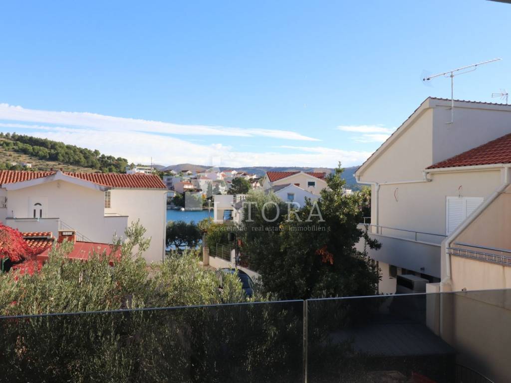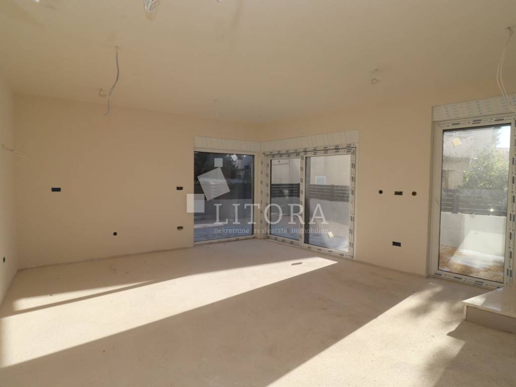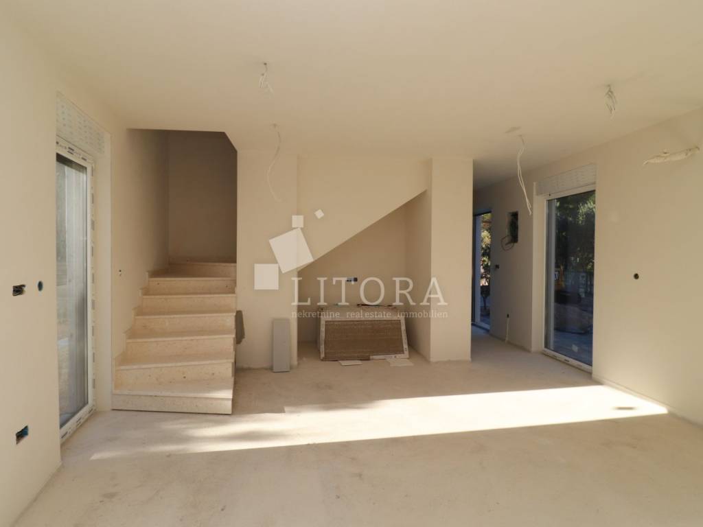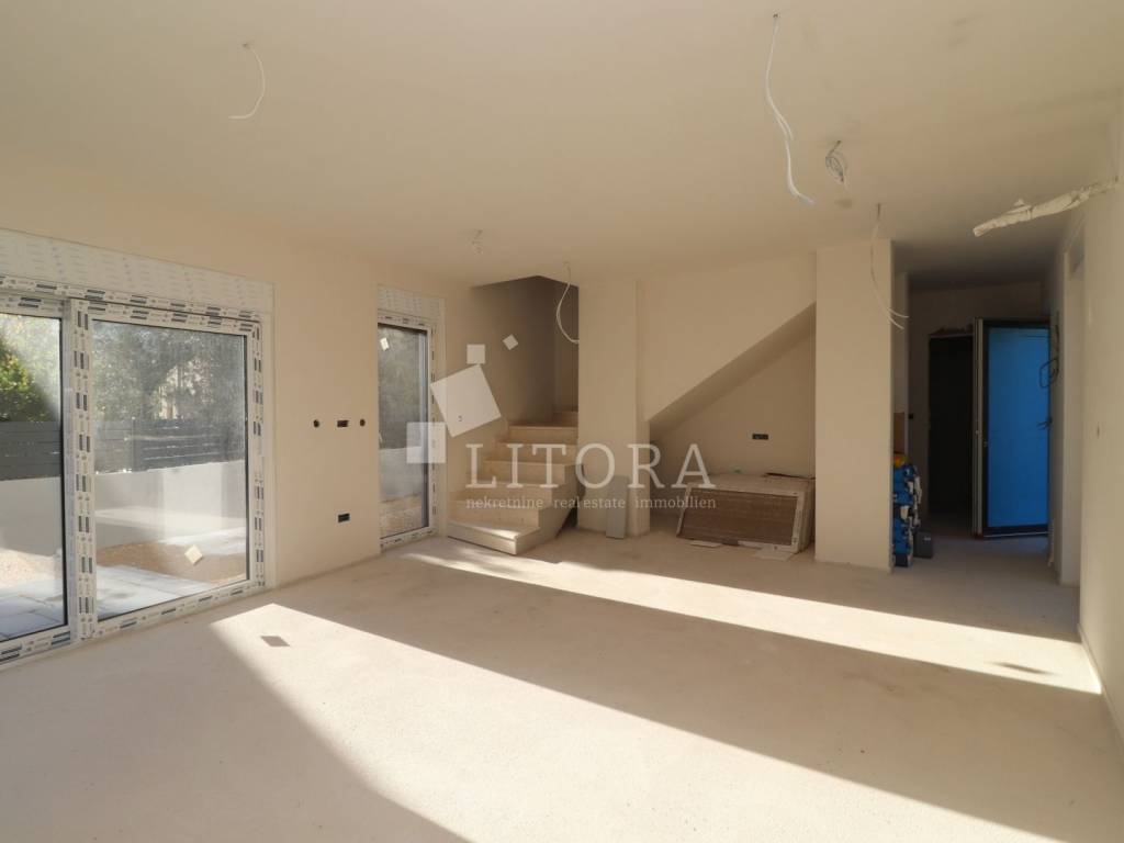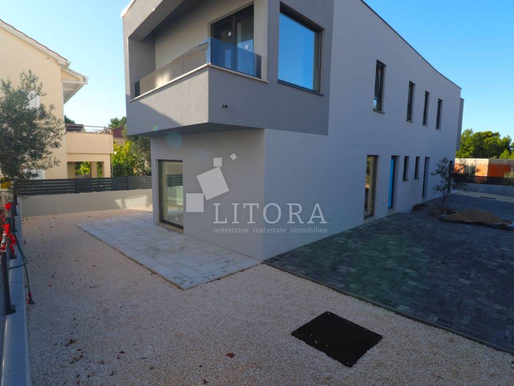 Žaborić – 3. red do mora obiteljska dvojna kuća moderne arhitekture na mirnoj lokaciji. Kuća ima dvije etaže (prizemlje + 1. kat), s ukupnom korisnom površinom od 135,72 m². Zelena površina površine 76,59 m2, velika terasa, 2 parkirna mjesta. Prizemlje se sastoji od predsoblja, spavaće sobe, kupaonice, te dnevnog boravka sa kuhinjom i blagovaonicom sa izlazom na terasu površine 23,15 m2. Unutarnje stepenice vode na 1. kat gdje se nalazi vešeraj, dvije spavaće sobe svaka sa vlastitom kupaonicom, terasa. Kuća je opremljena: visokokvalitetnim keramičkim oblogama, klima-uređaji u svim prostorijama, staklene ograde, podno grijanje u dnevnom boravku i kupaonicama. Udaljenost do plaže je 70 m, 450m do centra mjesta.