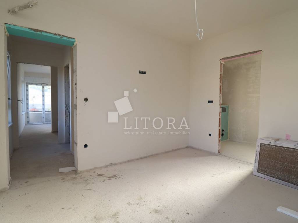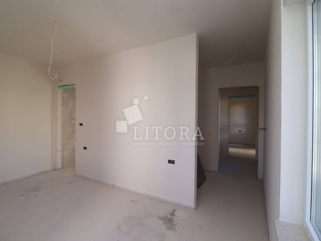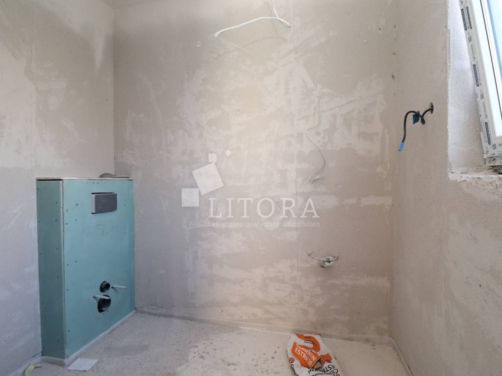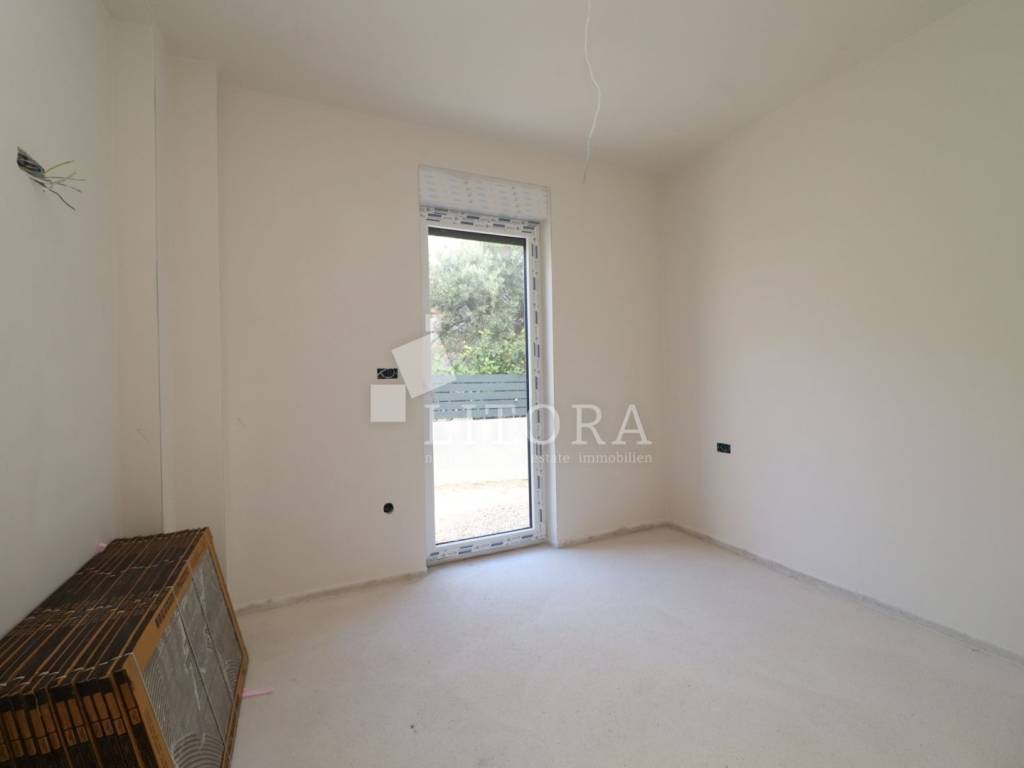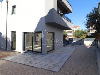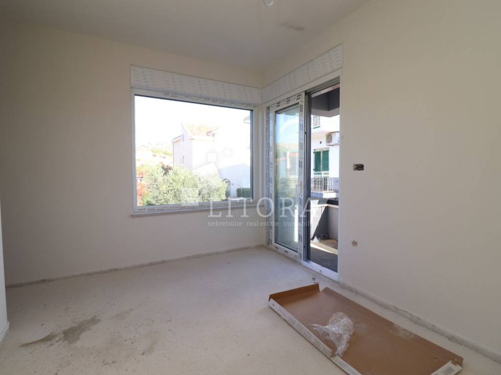 Žaborić – 3. red do mora obiteljska dvojna kuća moderne arhitekture na mirnoj lokaciji. Kuća ima dvije etaže (prizemlje + 1. kat), s ukupnom korisnom površinom od 135,72 m². Zelena površina površine 76,59 m2, velika terasa, 2 parkirna mjesta. Prizemlje se sastoji od predsoblja, spavaće sobe, kupaonice, te dnevnog boravka sa kuhinjom i blagovaonicom sa izlazom na terasu površine 23,15 m2. Unutarnje stepenice vode na 1. kat gdje se nalazi vešeraj, dvije spavaće sobe svaka sa vlastitom kupaonicom, terasa. Kuća je opremljena: visokokvalitetnim keramičkim oblogama, klima-uređaji u svim prostorijama, staklene ograde, podno grijanje u dnevnom boravku i kupaonicama. Udaljenost do plaže je 70 m, 450m do centra mjesta.