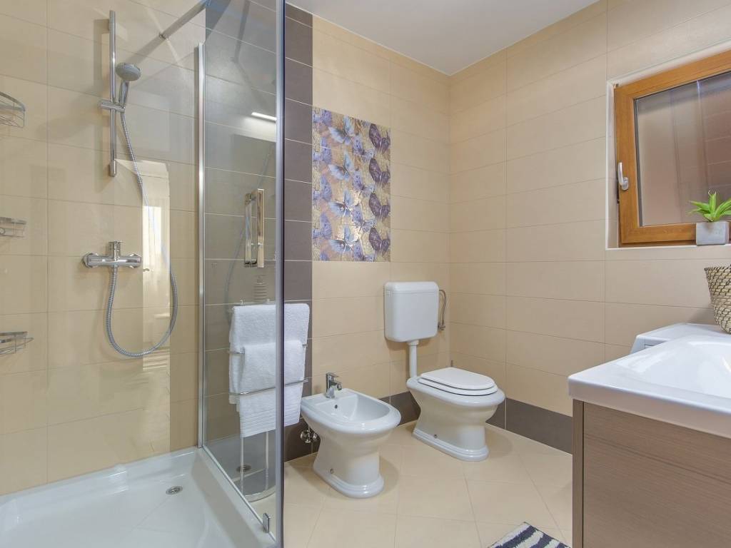 Dnevni boravak ima direktan izlaz na bazen i sunčalište te vrt koji gleda prema šumi. Na katu se nalaze dvije spavaće sobe, svaka s vlastitim privatnim kupatilom, te velika terasa s prekrasnim pogledom .