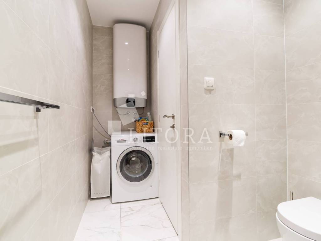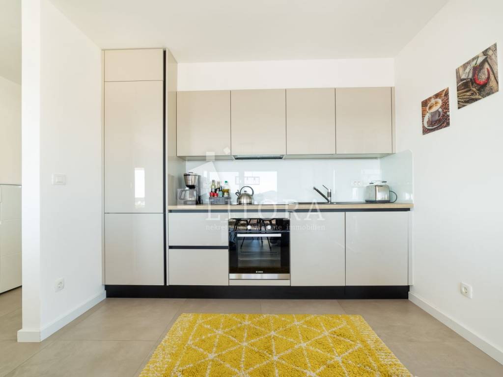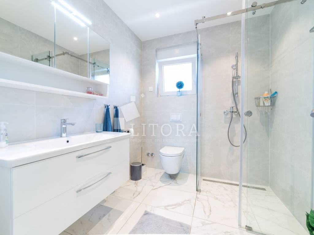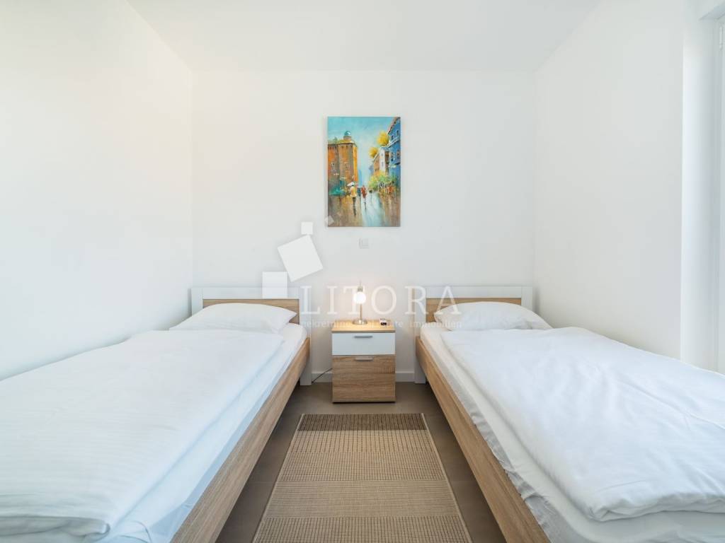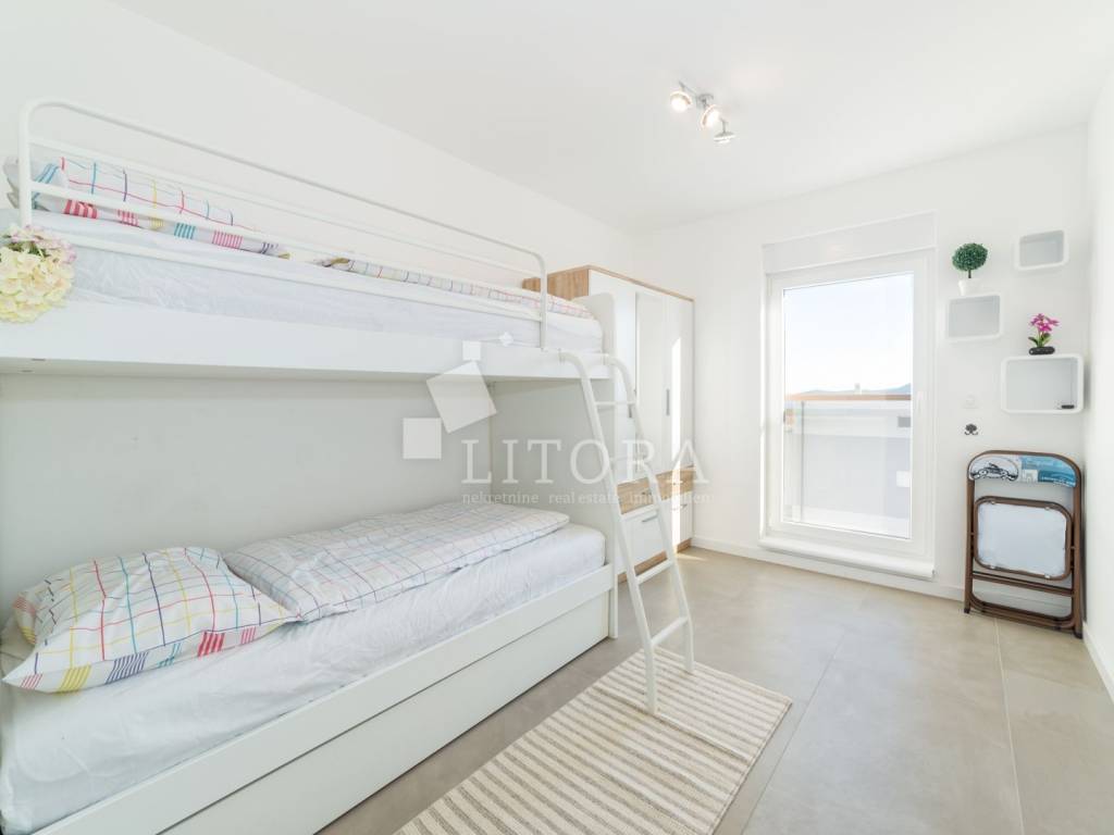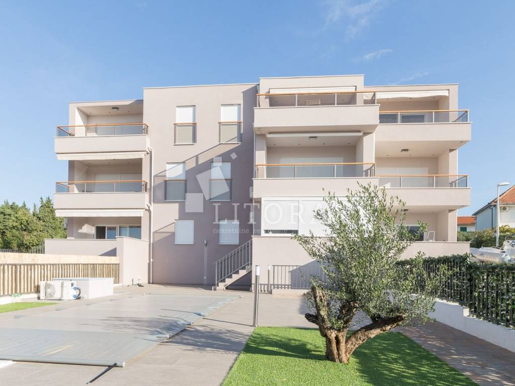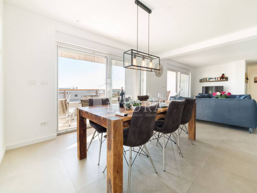 Vodice – namješteni 4-sobni apartman s panoramskim pogledom na more. Apartman ima 136,52 m² korisne površine i nalazi se na 2. katu u sklopu novije stambene zgrade. Orijentiran je prema južnoj strani i sastoji se od predsoblja, hodnika, dvije kupaonice, četiri spavaće sobe te prostrane kuhinje s dnevnim boravkom iz kojih se izlazi na veliku dijelom natkrivenu terasu od 29,72m2 s koje se pruža panoramski pogled na more. Apartman ima podno grijanje u dnevnom boravku i kupaonicama, kao i klima-uređaje u svim prostorijama te električne podizače roleta. Apartman je u potpunosti namješten, a kuhinja je u cijelosti opremljena i rađena po mjeri. Uz apartman dolazi jedno parkirno mjesto. Zgrada se nalazi na mirnoj lokaciji, udaljena 480 m od plaže i 600 m od centra grada.