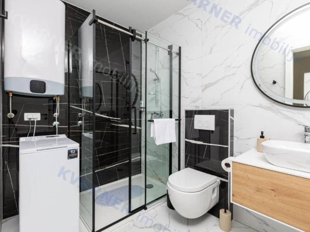 Apartman se nalazi na 1. katu; površine 88,42 m² a sastoji se od dnevnog boravka s kuhinjom i blagovaonice; tri spavaće sobe, tri kupaone, wc-a i natkrivene terase. Stanu pripada okućnica u površini od 66,45 m2 na kojoj se nalazi bazen. Stan se prodaje kompletno opremljen i namješten namještajem po mjeri te mu pripada 1 parkirno mjesto na okućnici zgrade. TOP lokacija - 200 metara od plaže!
