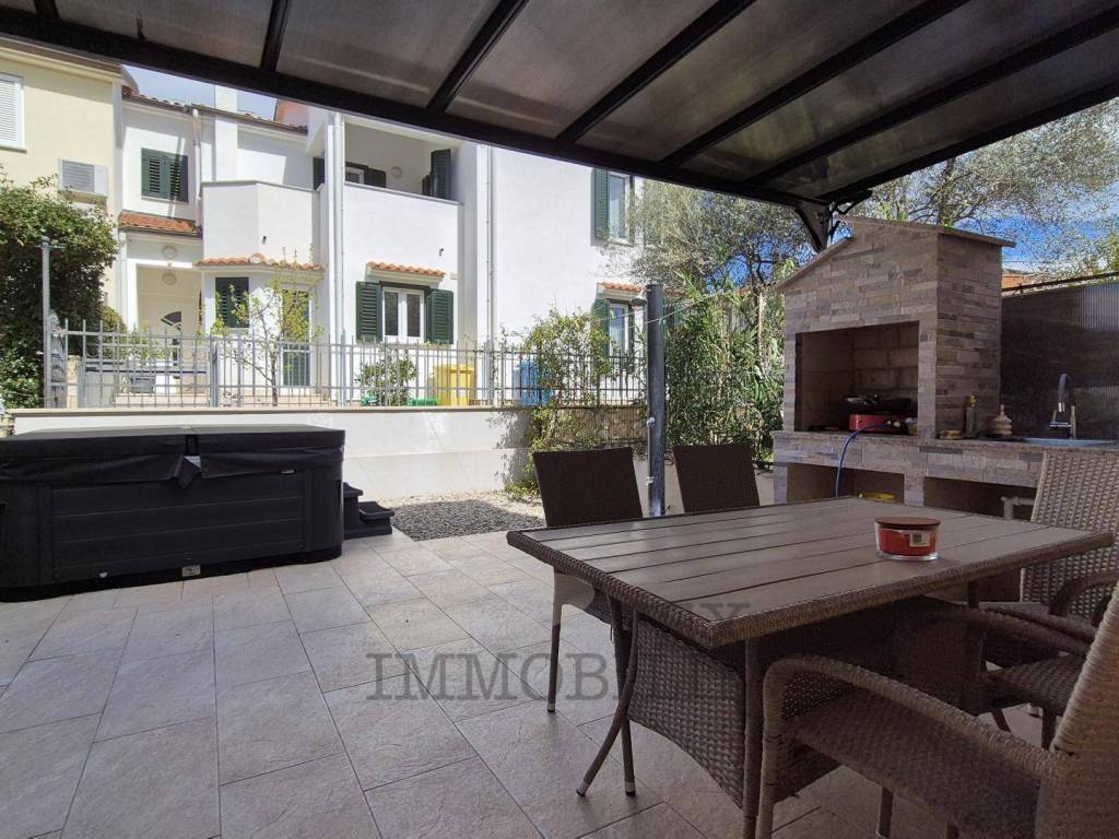 Ograđeno dvorište sadrži vrtni namještaj, vanjski whirlpool za pet osoba te roštilj.