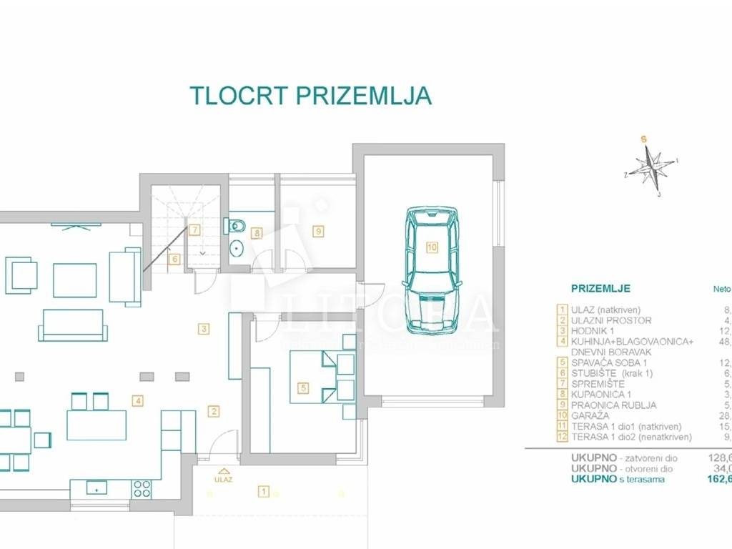Ražanj – Samostojeća kuća u mirnom okruženju, s pogledom na more i bazenom u izgradnji. Na osami, okružena prirodom i s otvorenim pogledom na more, smještena je novoizgrađena obiteljska kuća u fazi grubih građevinskih radova – idealna za obiteljski odmor ili kao investicija u turizam. Kuća se prostire na tri etaže (prizemlje + 1. kat + 2. kat), s ukupnom korisnom površinom od 315,72 m², i smještena je na prostranoj parceli površine 948 m². Prema projektu, raspored prostorija je sljedeći: Prizemlje: garaža, ulazni hodnik, kupaonica, praonica rublja, spremište, jedna spavaća soba, prostrani dnevni boravak s kuhinjom i blagovaonicom, te izlaz na veliku natkrivenu terasu uz koju se nalazi bazen u izgradnji površine 41,55 m². Prvi kat: tri spavaće sobe, svaka s vlastitom kupaonicom, hodnik, dodatna kupaonica i natkrivena terasa s prekrasnim pogledom na more. Drugi kat: izdvojena spavaća soba s kupaonicom te prostrana krovna terasa s panoramskim pogledom na more i okolni krajolik. Na parceli je također izgrađena dvorišna kućica/pomoćni objekt površine 27 m². Nekretnina se prodaje u trenutnoj fazi izgradnje – izvedeni su svi grubi građevinski radovi te konstrukcija bazena. Lokacija je iznimno mirna i ugodna, idealna za obiteljski život ili bavljenje turizmom. Udaljenost do mora i plaže je 1.500 m, a do centra Rogoznice svega 8 km.