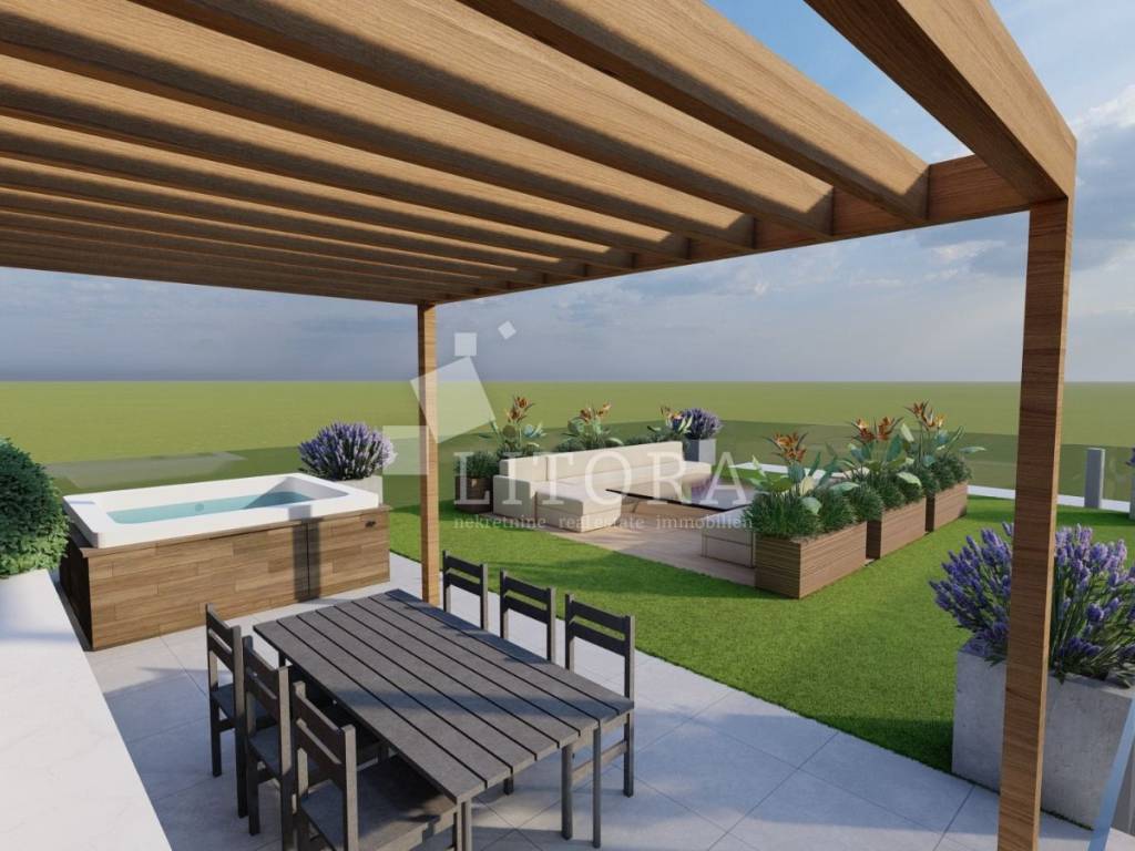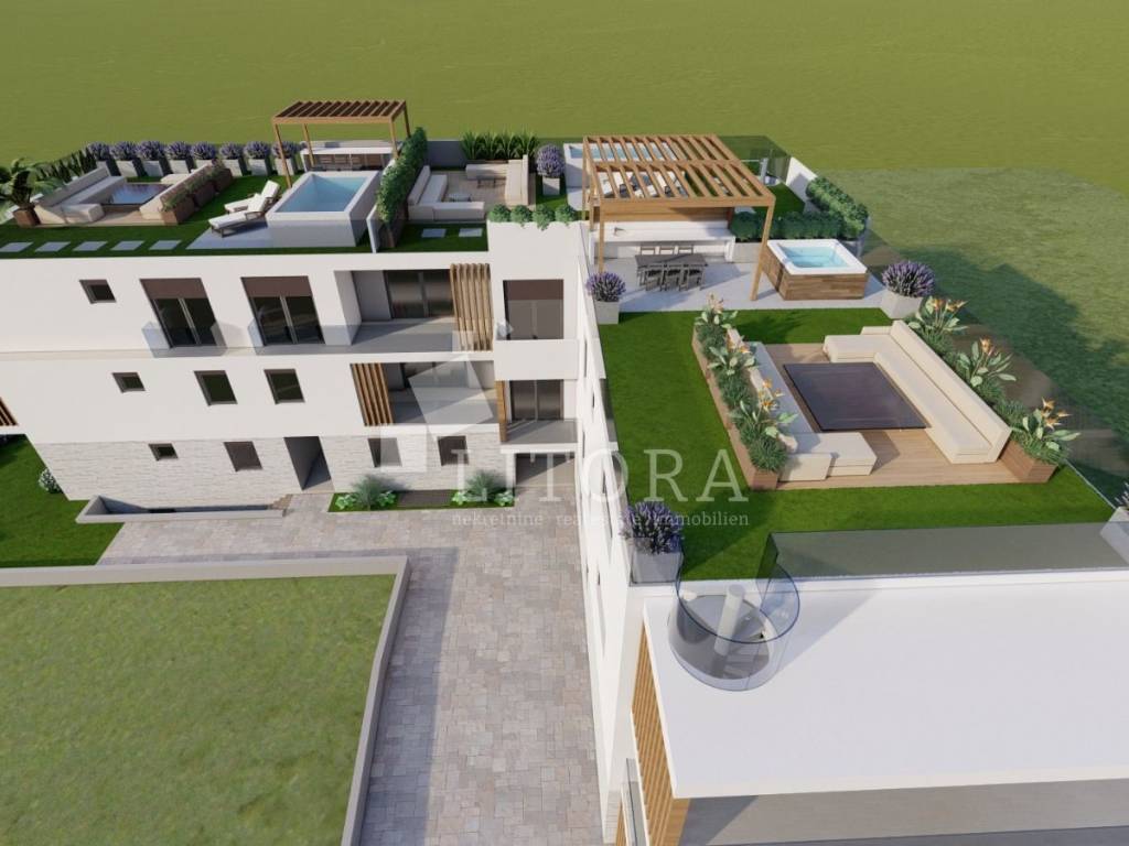 Vodice, širi centar – 2. red do mora, novogradnja – dva apartmana u prizemlju, 100 m od plaže. Na izuzetnoj lokaciji u Vodicama, u mirnom dijelu šireg centra, prodaje se stambena jedinica na 2. katu + krovna terasa novogradnje, smještena u 2. redu do mora, svega 100 m od plaže i 400 m od centra grada. Stambena jedinica S8 ima 210,04 m2 ukupne korisne površine a sastoji se od hodnika, 3 spavaće sobe, kupaonice, WC-a, dnevnog boravka sa kuhinjom i blagovaonicom te izlaza na terasu površine 27,04 m2 sa koje spiralne stepenice vode na krovnu terasu 118,07 površine te bazenom površine 10,56 m2. Zgrada je modernog izgleda i bit će opremljena visokokvalitetnim podnim oblogama, unutarnjom i vanjskom stolarijom, klima uređajima za grijanje i hlađenje u svakoj prostoriji, električnim podizačima roleta, komarnicima, podno grijanje u kupaonicama. Apartmanu pripada jedno garažno mjesto. Zgrada se nalazi samo 100 m od plaže, a 400 m od centra. Predviđeni termin useljenja je ljeto 2026 godine.