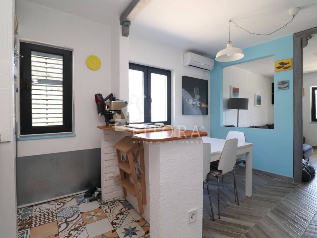 Apartman se nalazi na prvom katu i zauzima cijelu etažu. Smješten je u neposrednoj blizini centra mjesta – svega 110 metara od mora/rive, a 500 metara od uređene plaže.