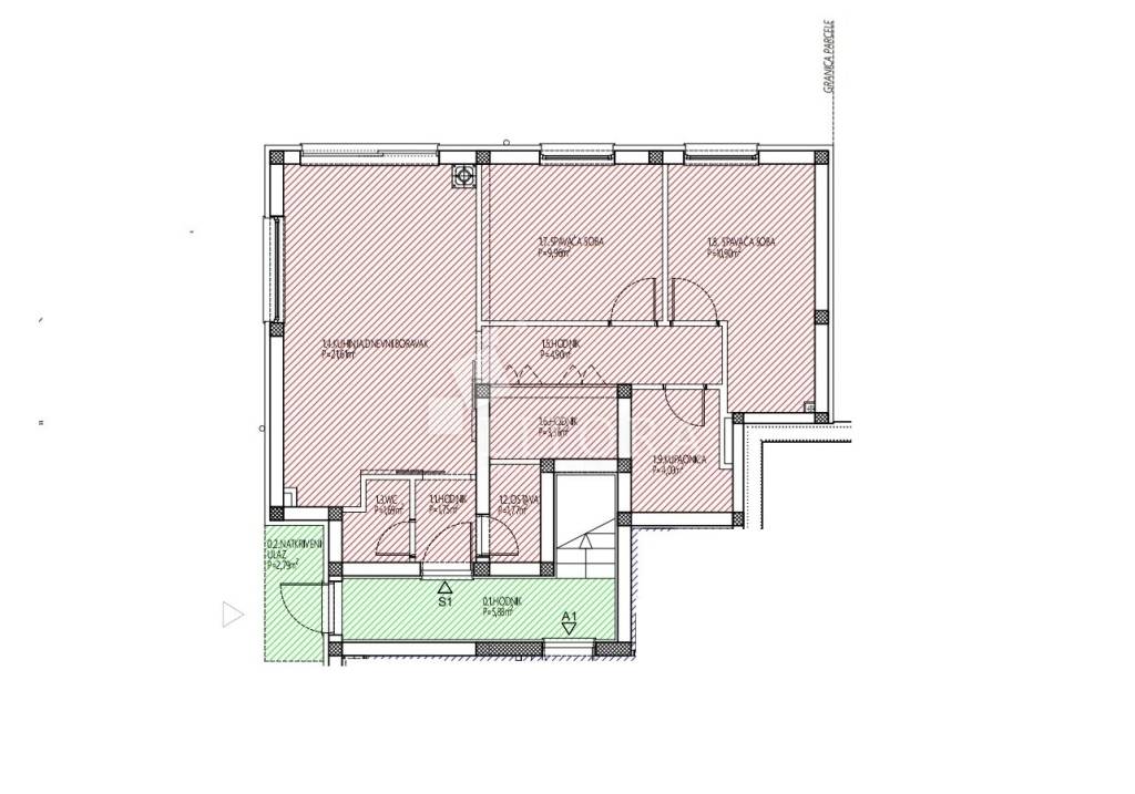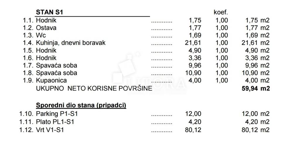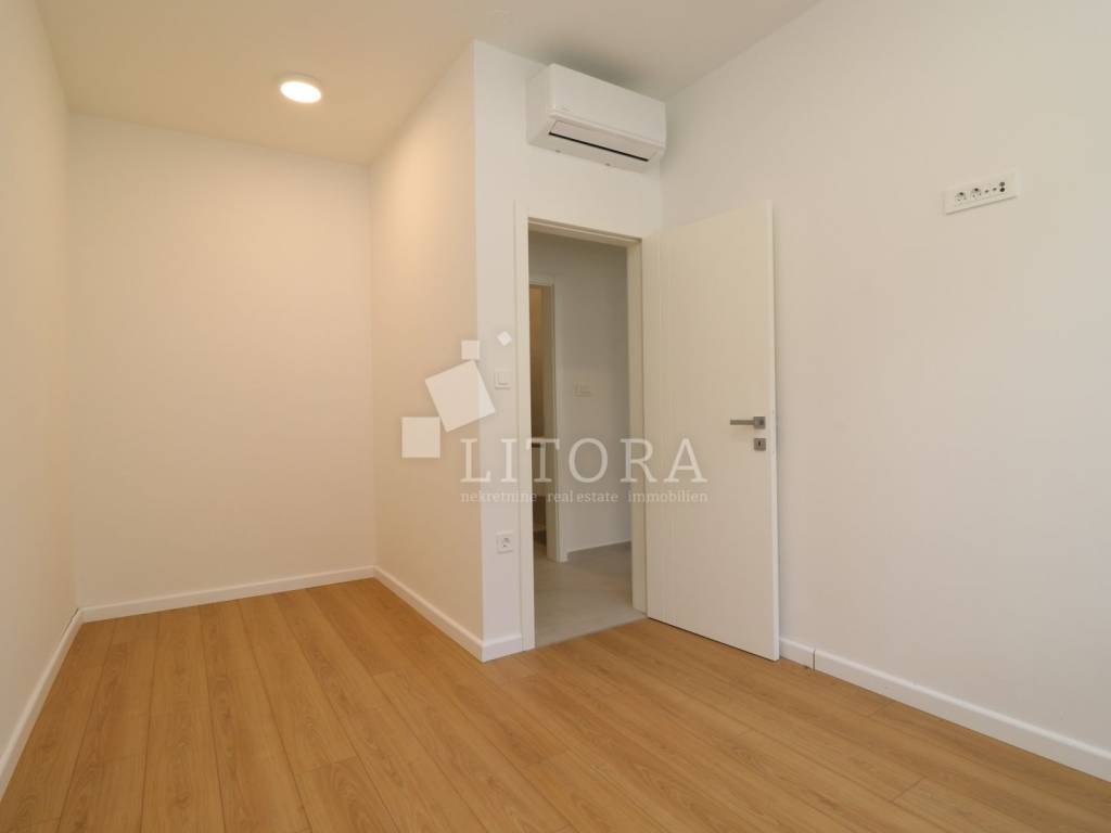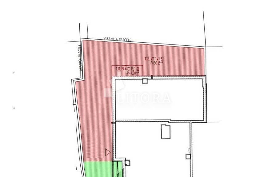Apartman se nalazi u prizemlju novoizgrađene višestambene zgrade, orijentiran na sjevernu stranu. Ukupna korisna površina iznosi 70,77 m², a sastoji se od hodnika, ostave, WC-a, kuhinje s blagovaonicom i dnevnim boravkom s izlazom na terasu i popločano dvorište površine 80,12 m². Nadalje, stan ima još jedan hodnik, dvije spavaće sobe, kupaonicu i dodatno spremište. Apartmanu pripada jedno parkirno mjesto.