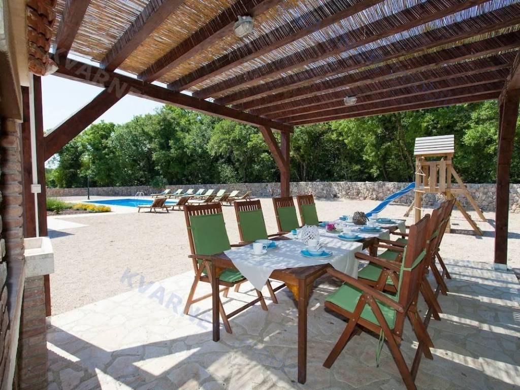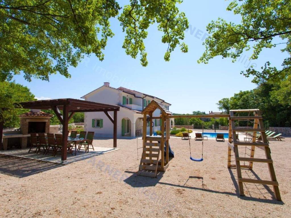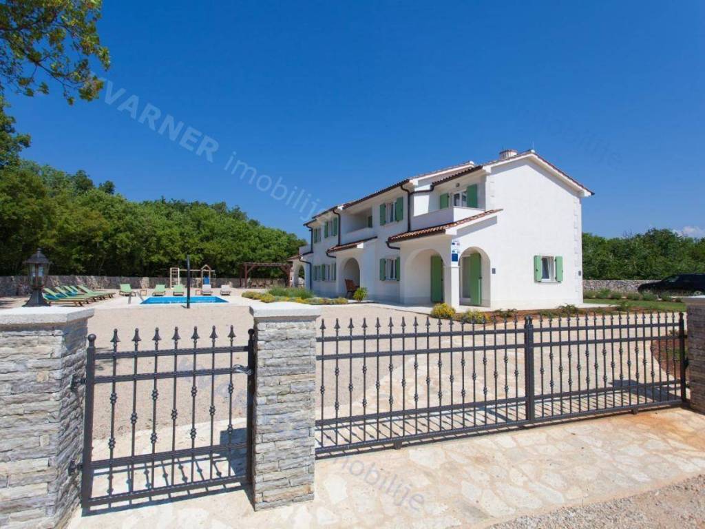 Prodaje se luksuzna vila s tri zasebne stambene jedinice i zajedničkim bazenom! Vila se sastoji od prizemlja i kata. U prizemlju svake jedinice nalazi se kuhinja s dnevnim boravkom, spremište, WC i natkrivena terasa. Unutarnje stepenice vode na kat, gdje se nalaze dvije spavaće sobe, kupaonica i terasa. Na prekrasnoj, velikoj okućnici površine 1.734 m2 nalazi se bazen od 45 m2, dječje igralište, roštilj zona i sjenica. Okućnica je opremljena sustavom automatskog navodnjavanja te oplemenjena mediteranskim biljem i zelenilom. Objekt je smješten u mirnom okruženju na rubu šume, s pogledom na zeleni okoliš. Vila je udaljena oko 5 km od mora i svih sadržaja. Ovaj objekt je idealan za investiciju i bavljenje turističkim iznajmljivanjem. Okolica mjesta Dobrinj nudi brojne mogućnosti za uživanje u šetnjama kroz šumu, biciklizmu i raznim aktivnostima na otvorenom.