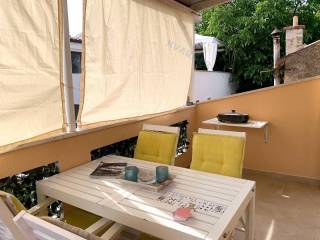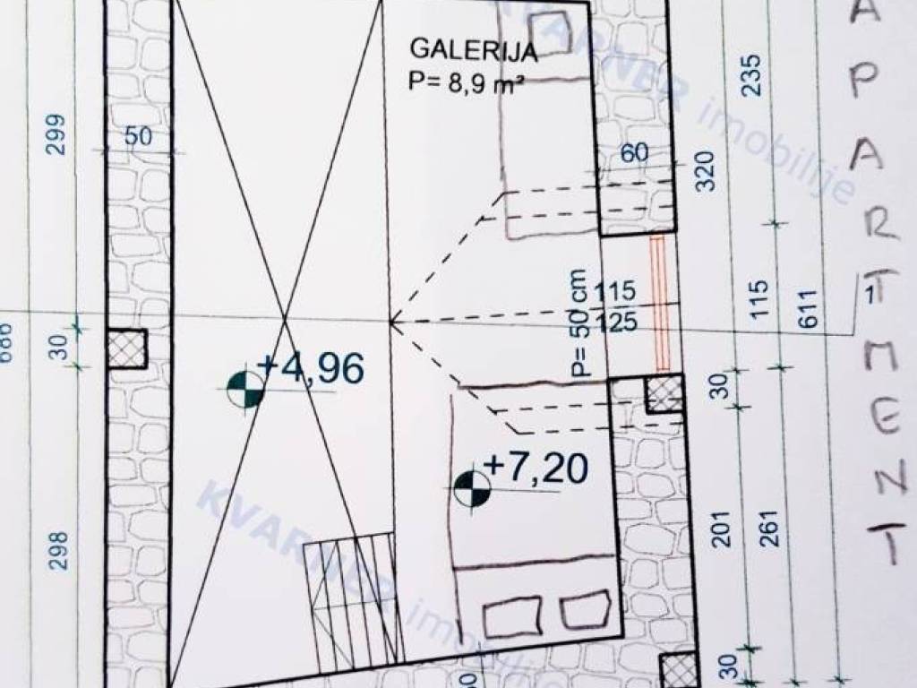 U prizemlju se nalazi studio apartman površine 26 m² s pripadajućom ulaznom terasom koja je dio uređenog dvorišta. Na drugom katu smješten je prostrani apartman površine 53 m², kojem pripada terasa od 11 m². Apartman se sastoji od dnevnog boravka i kupaonice na prvoj etaži, dok se na drugoj etaži nalazi spavaća soba. Uz to, galerijski prostor također ima funkciju spavaće sobe, a s njega se pruža djelomičan pogled na more.