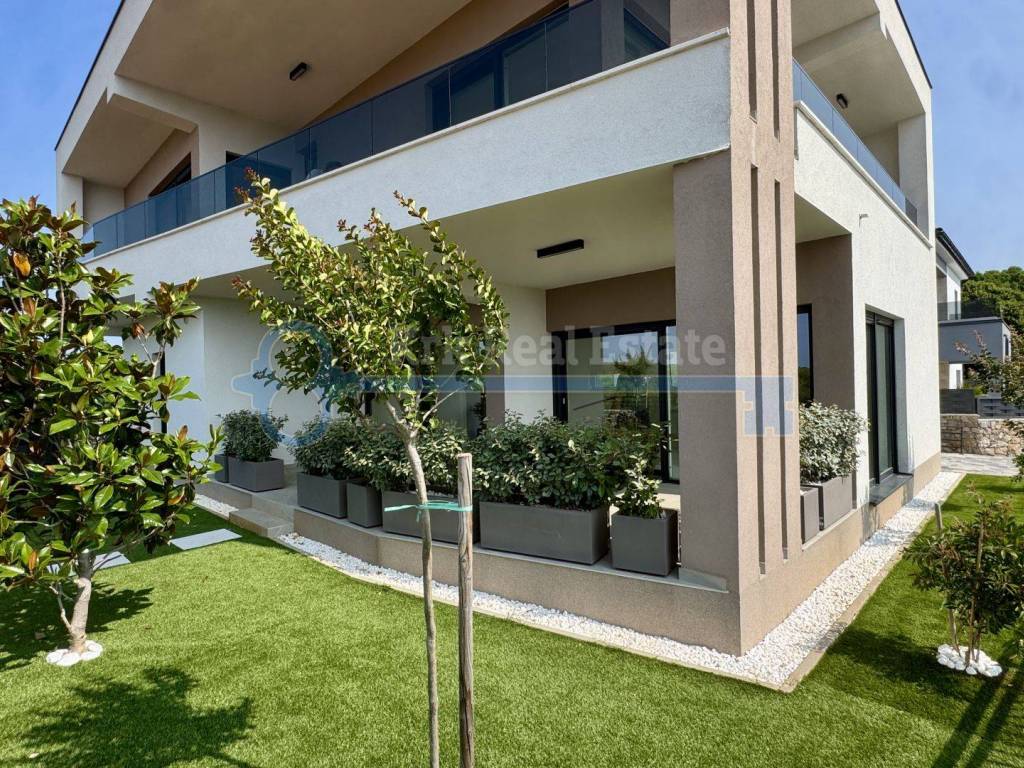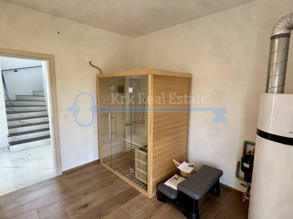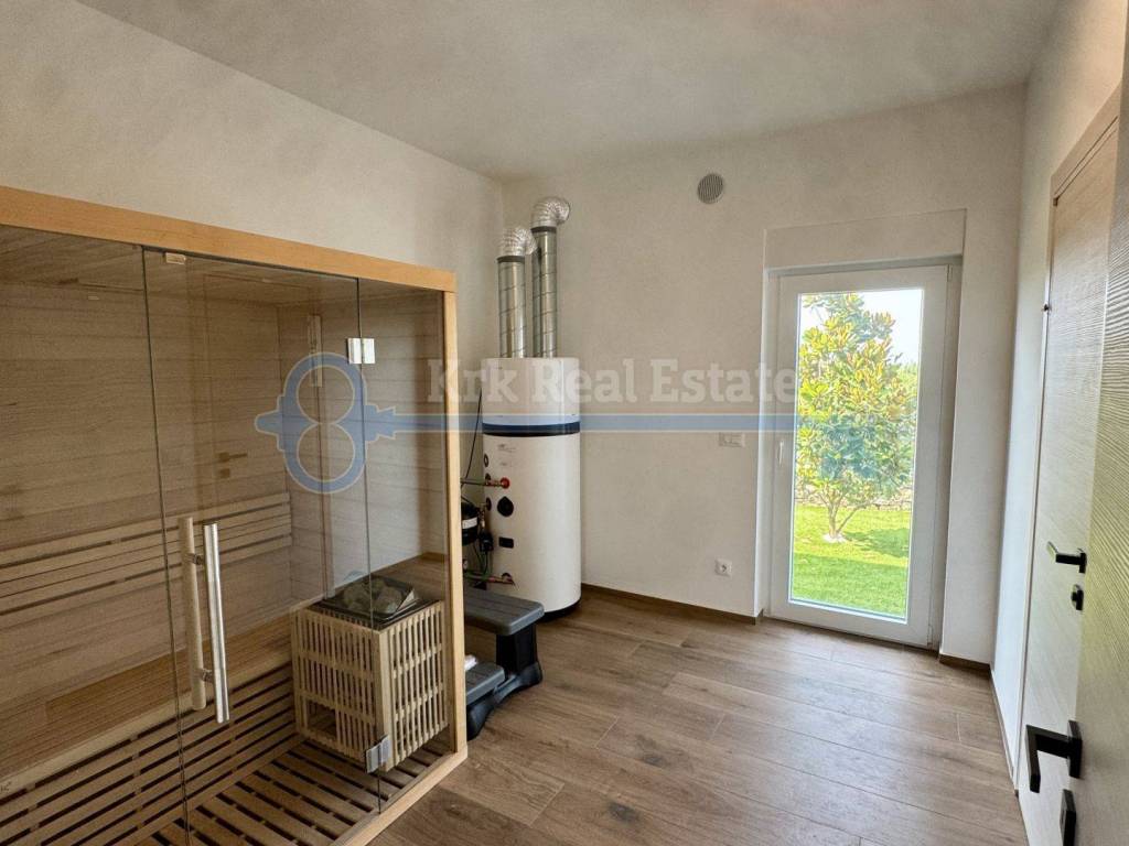 Na prodaju je samostojeća kuća stambene površine od 200 m2. Kuća se prostire na dvije etaže. U prizemlju se nalazi prostrani dnevni boravak sa kaminom, te prostorija namjenjena za kuhinju i blagavaonicu ,kupaonica, vešeraj te velika natkrivena terasa sa poglednom na bazen. Prvi kat kuće sastoji se od hodnika, vešeraja te tri prostrane sobe svaka sa vlastitom kupaonicom i izlazom na terasu. Podno grijanje i klimatizacija osiguravaju optimalnu temperaturu tjekom cijele godine dok video nadzor i alarmni sustav pružaju dodatnu sigurnost. Kuća također ima vanjski i unutarnji kamin te dva parkirna mjesta u posjedu. Pripada joj okućnica površine 600 m2 sa bazenom. Udaljena je od mora i plaže 1500 metara.