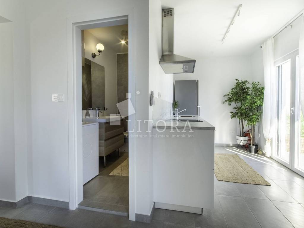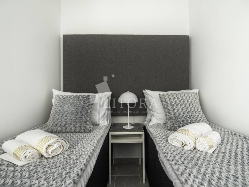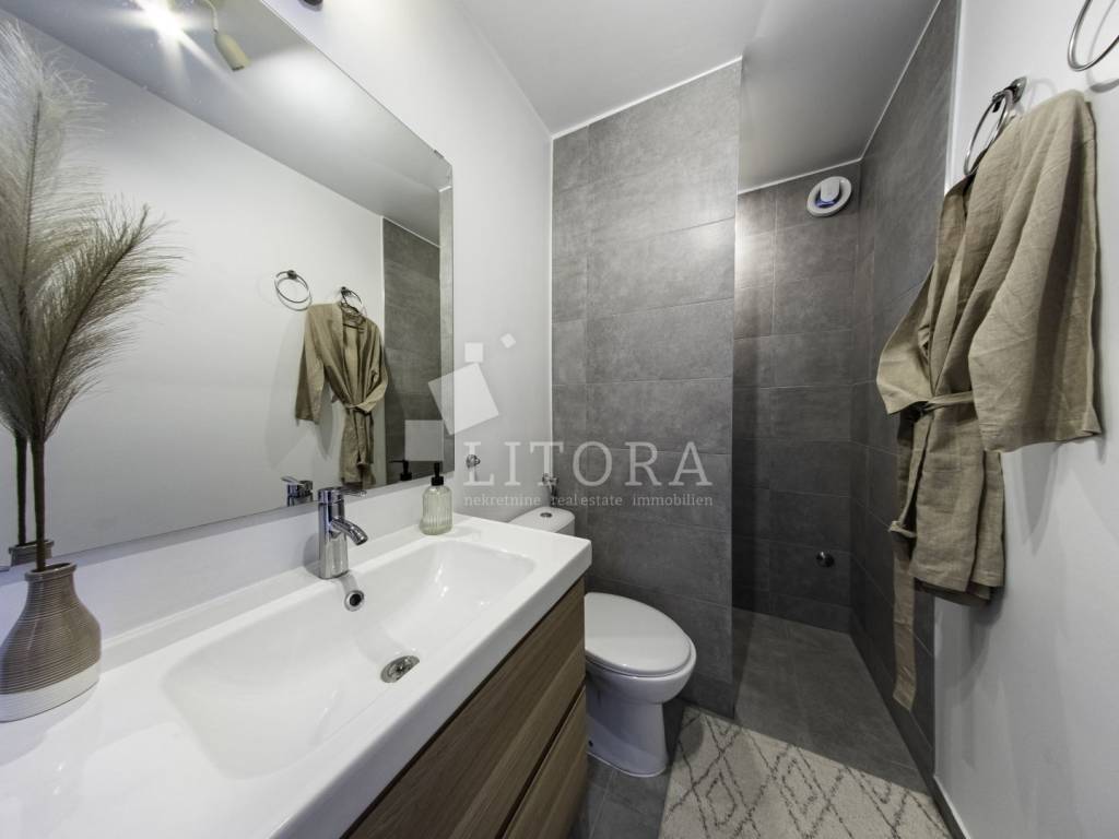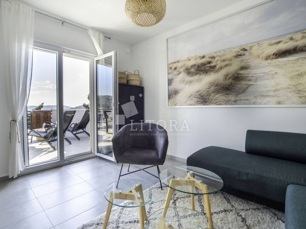 Rogoznica, širi centar nalazi se 2-soban apartman sa panoramskim pogledom na more. Zgrada se sastoji od tri stambene jedinice, a svaka je klimatizirana, potpuno namještena i ima osigurano vlastito parkirno mjesto, što ovu nekretninu čini izvrsnim izborom kako za osobne potrebe, tako i kao investiciju u turistički najam. Stambena jedinica S3 nalazi se na prvom katu objekta, ima poseban ulaz i ukupnu korisnu površinu od 82,20 m². Orijentirana je prema jugu te se sastoji od dnevnog boravka s kuhinjom i blagovaonicom, dvije spavaće sobe i dvije kupaonice. Posebnu vrijednost stanu daje prostrana nenatkrivena terasa od 31,80 m² s panoramskim pogledom na more. Stanu pripada i ostava od 12,05 m². Uz navedeno, vlasniku stana pripada isključivo pravo korištenja fitness prostora (GYM) u prizemlju te krovne terase s prekrasnim pogledom na cijelu Rogoznicu i more. Lokacija je odlična – svega 100 metara od mora i 150 metara od centra mjesta, a blizina svih sadržaja potrebnih za svakodnevni život jamči udobnost i praktičnost. Zahvaljujući zasebnom ulazu, stan pruža mir, privatnost i osjećaj intimnog mediteranskog kutka, dok atraktivna lokacija i dodatni sadržaji čine ovu nekretninu idealnim izborom za ugodan obiteljski život, bezbrižan odmor ili kao sigurno ulaganje u turizam.