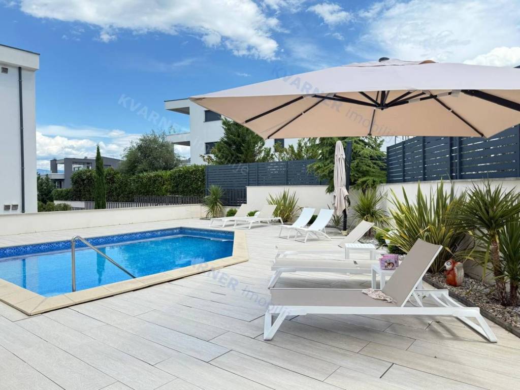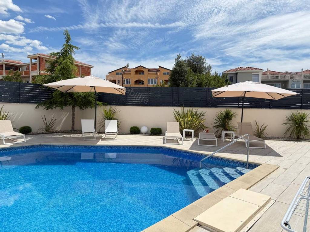 Kuća se prostire na dvije etaže ukupne stambene površine od približno 160 kvadratnih metara. U prizemlju se nalazi prostrana kuhinja s blagovaonicom i dnevnim boravkom koji imaju izlaz na lijepo uređenu okućnicu s privatnim bazenom i sunčalištem, što ovu nekretninu čini idealnom za uživanje tijekom toplih ljetnih mjeseci. Na istoj etaži nalazi se i gostinjski toalet i spavaća soba sa vlastitom kupaonicom.