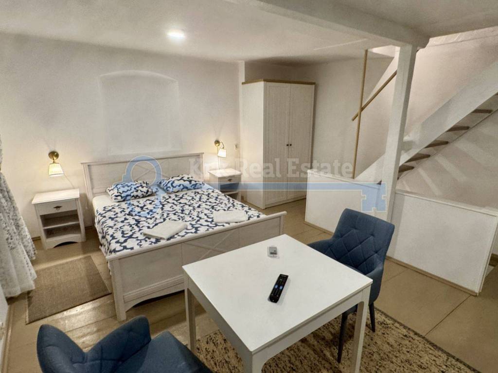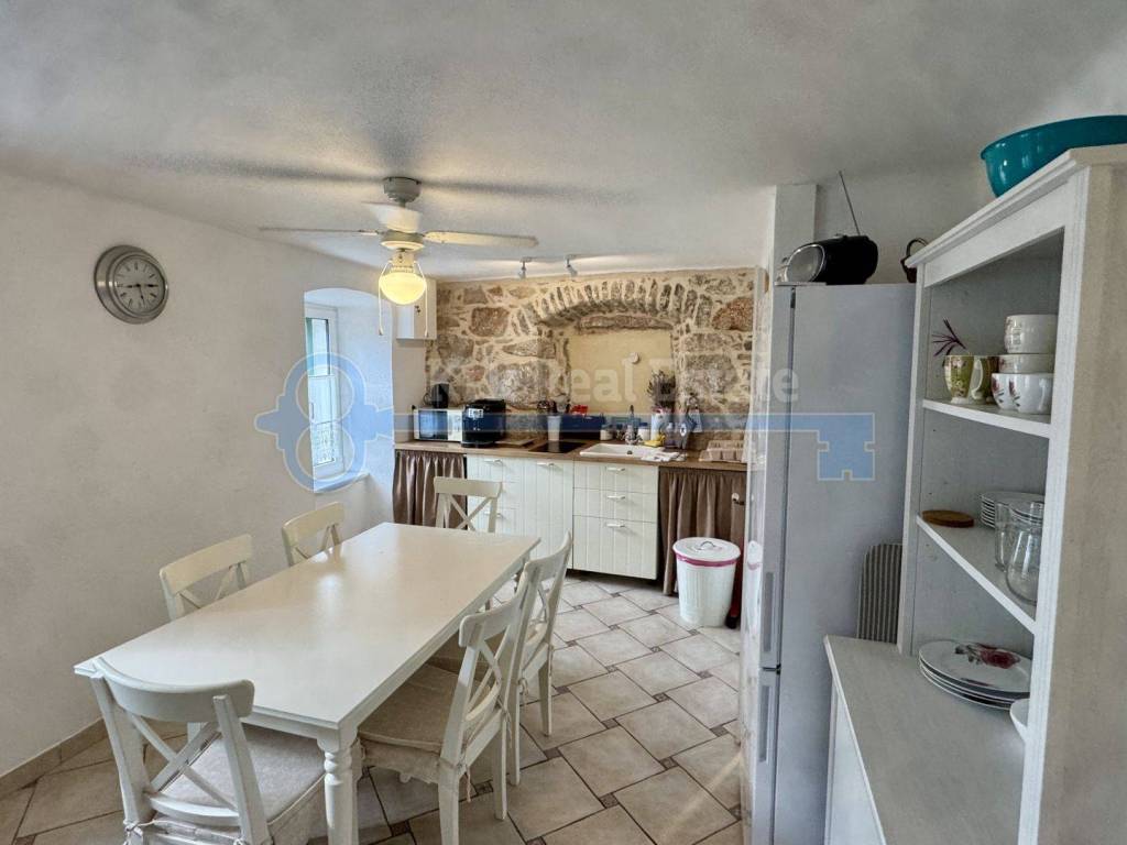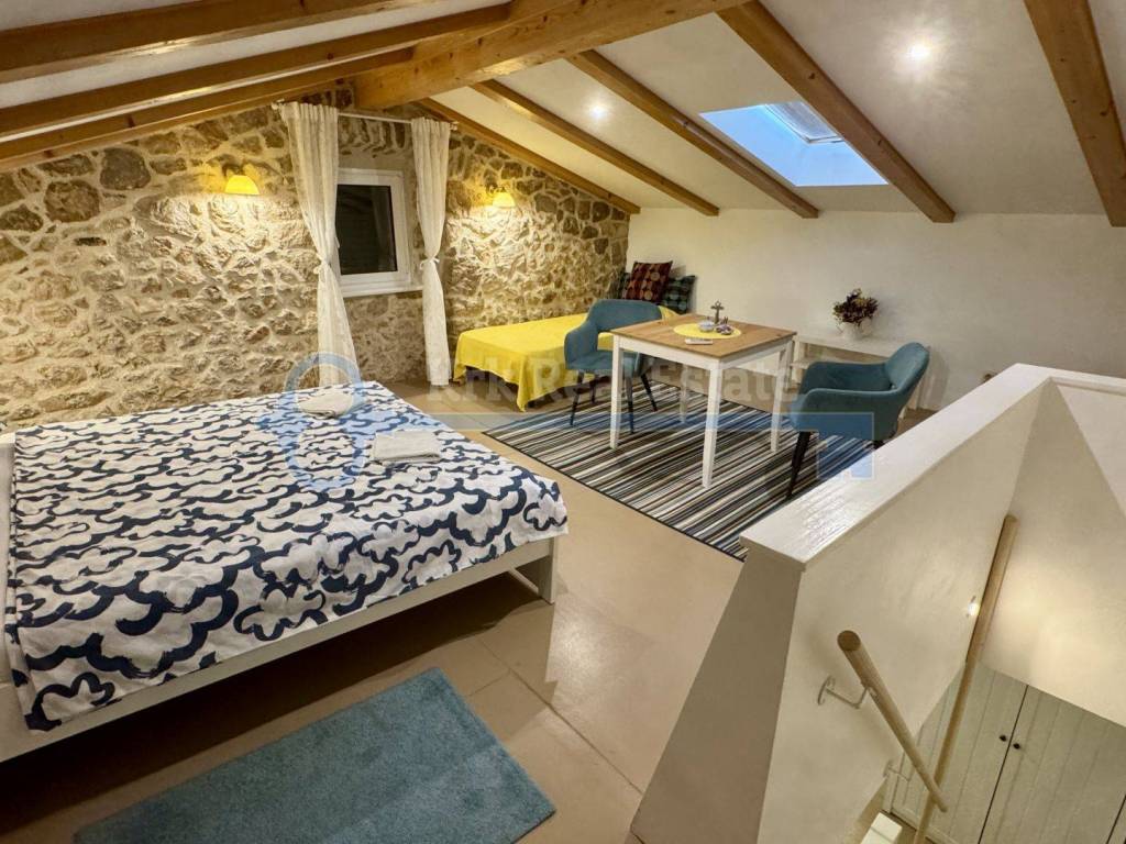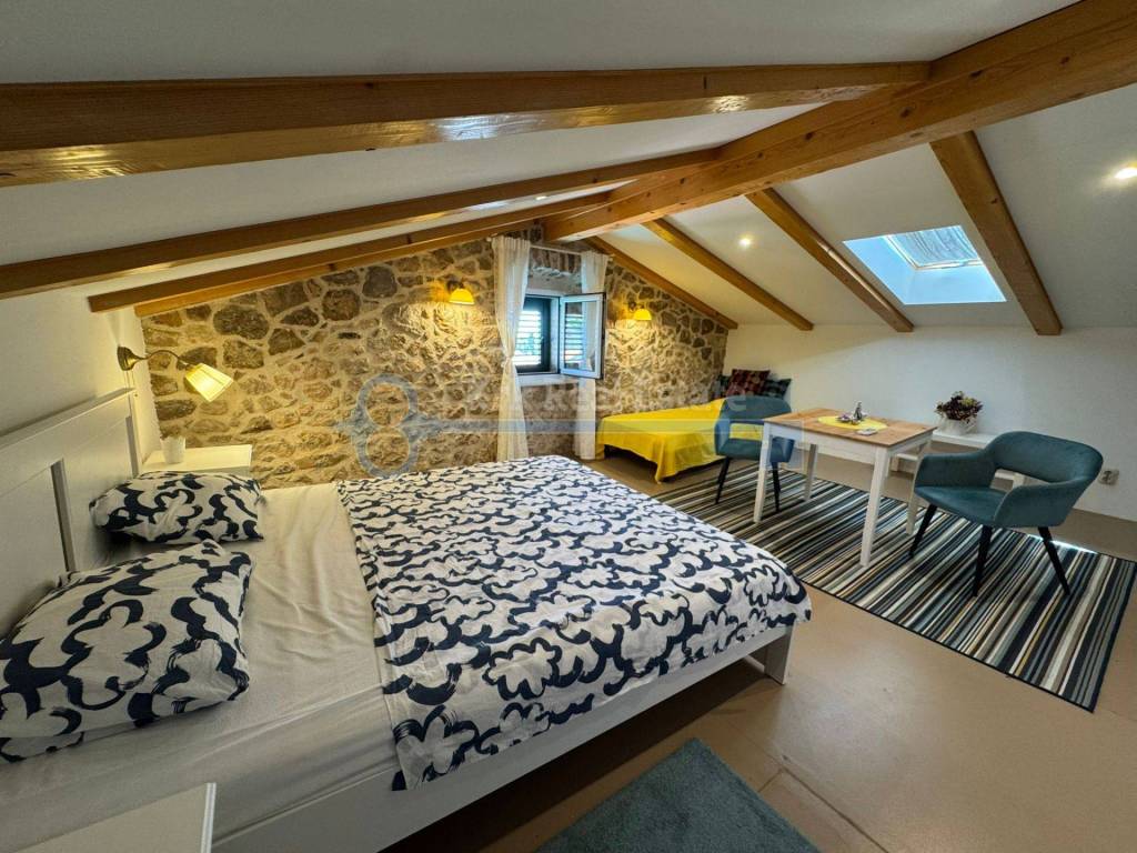 Na prodaju je renovirana kamena kuća stambene površine od 100 m2, spremna za iznajmljivanje. Sastoji se od prizemlja, prvog kata, drugog kata i visokog potkrovlja. U prizemlju se nalazi studio apartman. Na prvom katu se nalazi kuhinja, blagovaonica i kupaonica, na drugom katu i visokom potkrovlju se nalazi po jedna spavaća soba. Pripada joj okućnica površine 15 m2 na kojoj se nalazi dodatni objekt, vrtna kućica, u naravi studio površine 15 m2 potpuno opremljen za boravak. Nalazi se na mirnoj lokaciji, u staroj jezgri, udaljena od mora samo 280 metara.
