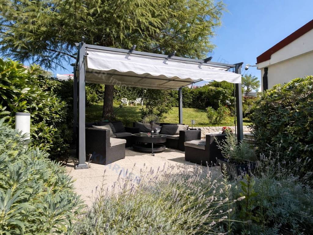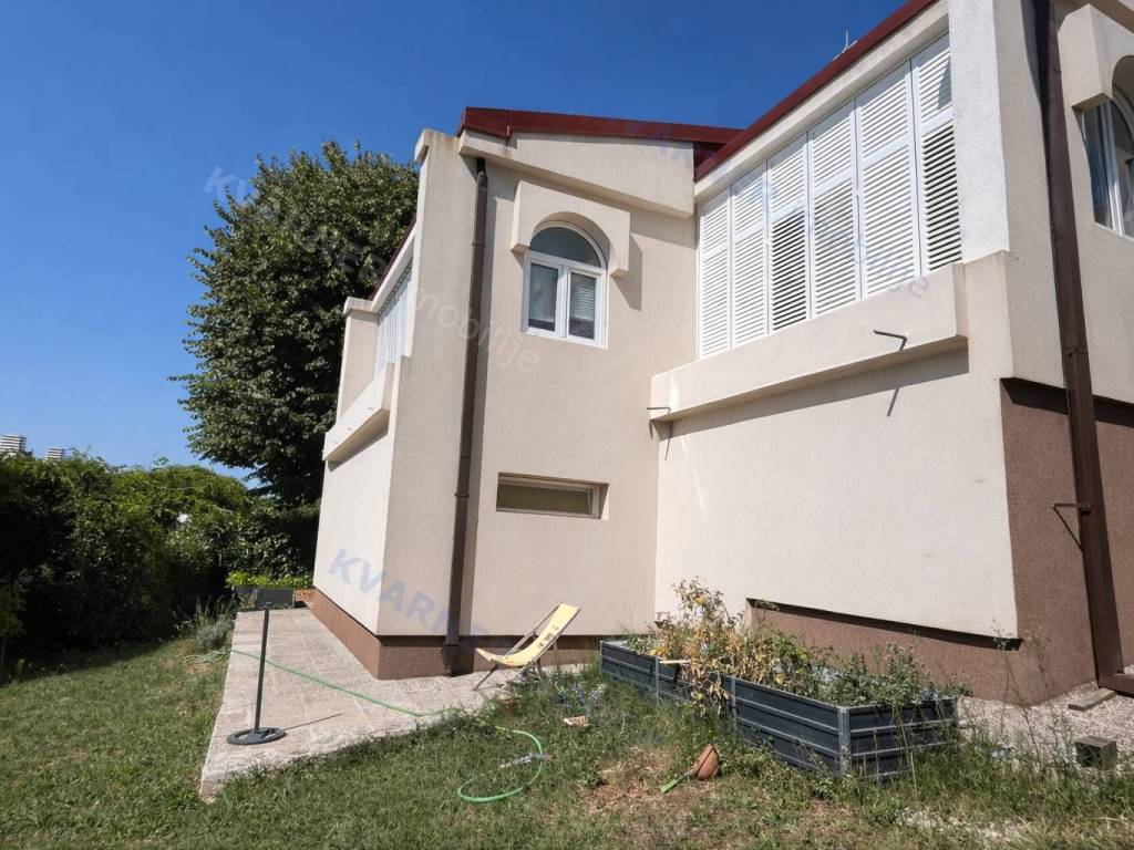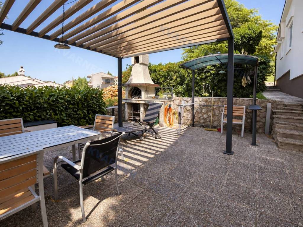 Okućnica nudi natkrivenu terasu, vanjsku kuhinju, kameni roštilj, garažu i više parkirnih mjesta. Kuća je kvalitetno građena i potpuno opremljena: ALU i drvena stolarija, klima uređaji u svim prostorijama, kamin, video nadzor, centralno grijanje na lož ulje i protuprovalna vrata.