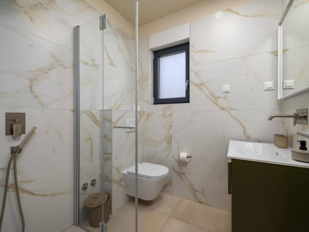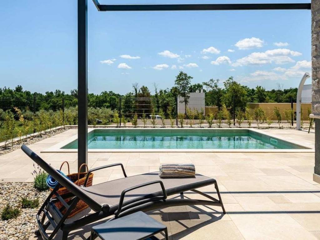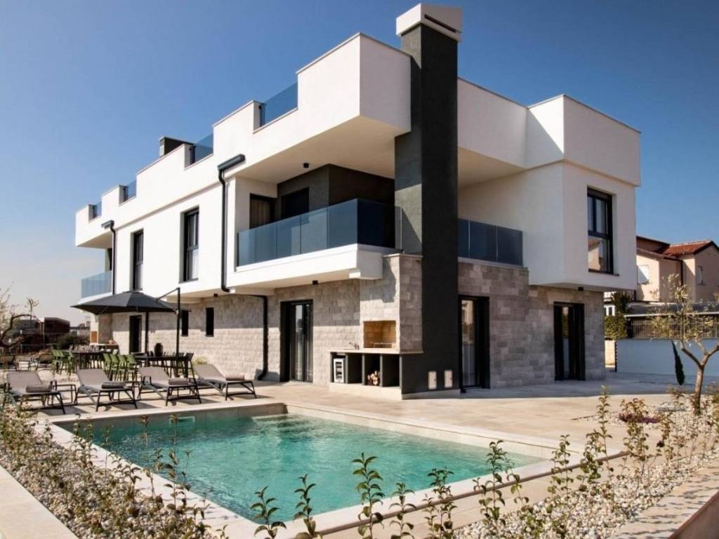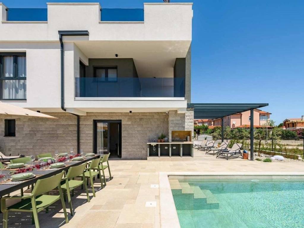 Predstavljamo Vam ovu novu modernu villu koja se nalazi u Vabrigi svega 1 km od mora, te 7 km od Poreča. Vila ima 150m2 stambene površine i nalazi se na zemljištu veličine 360m2. Prostire se na tri etaže: prizemlje, kat i krovnu terasu. U prizemlju se nalazi dnevni boravak, kuhinja, blagovaonica, spavaća soba s kupaonicom i gostinjski WC. Na katu se nalaze još dvije dvokrevetne spavaće sobe, jedna dječja soba, te dvije kupaonice i gostinjski WC. Stepeništem se penjemo na krovnu terasu gdje se nalazi jacuzzi i ljetna kuhinja, te sa koje se pruža prekrasan pogled na zelenilo. Iz dnevnog boravka se izlazi na sunčalište i bazen veličine 24m2, te se nadomak njega nalazi natkrivena terasa i ljetna kuhinja. Vila ima dva parkirna mjesta. Više na upit.