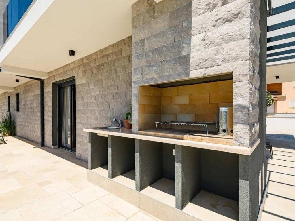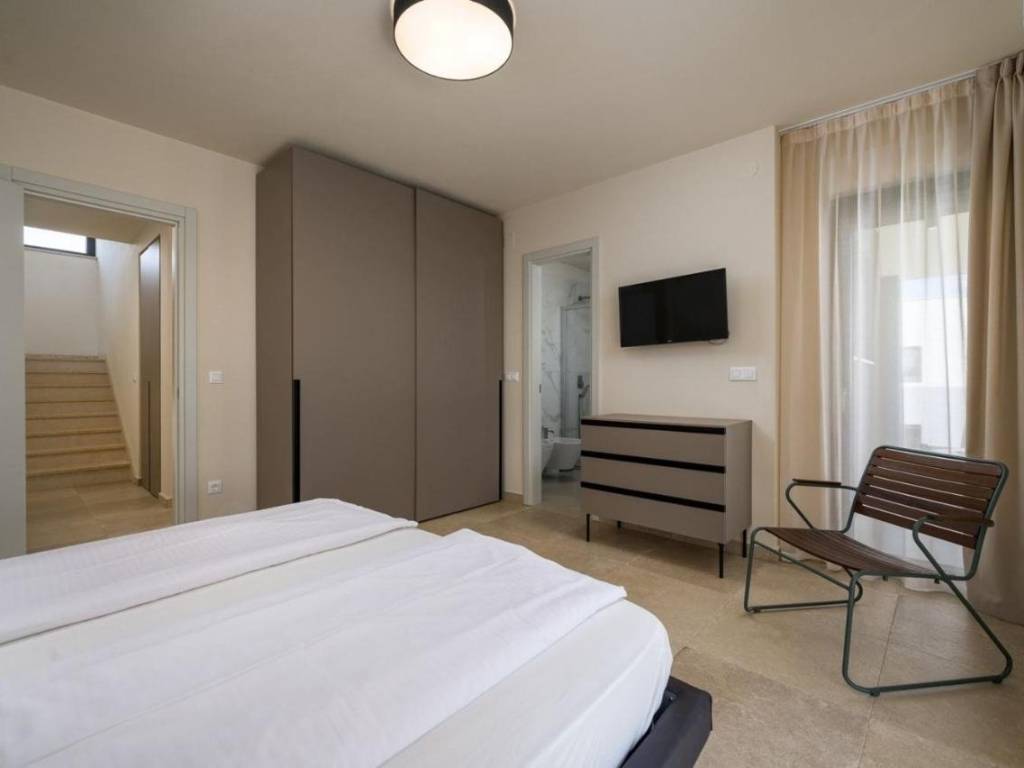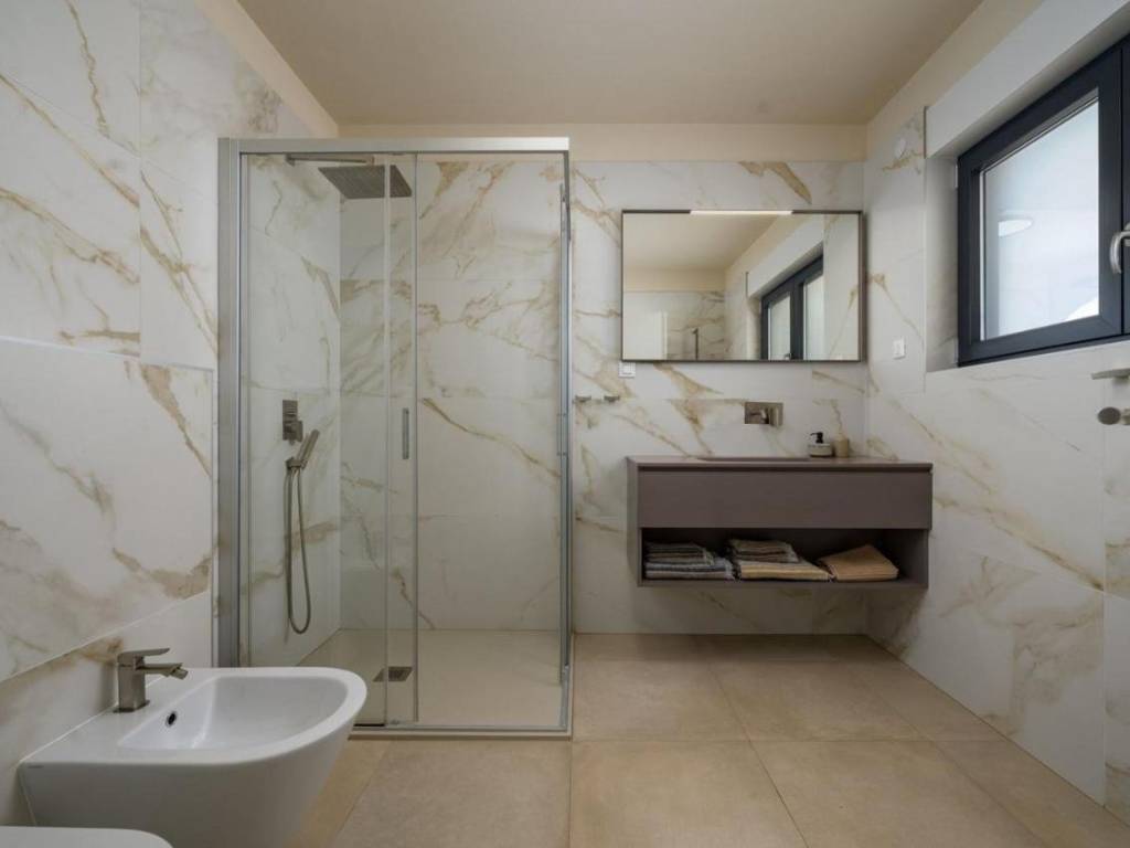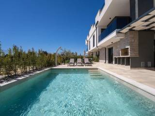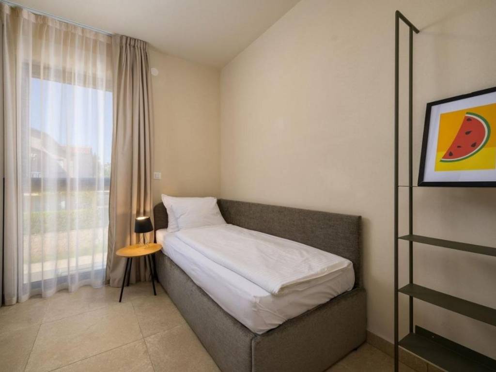 Predstavljamo Vam ovu novu modernu villu koja se nalazi u Vabrigi svega 1 km od mora, te 7 km od Poreča. Vila ima 150m2 stambene površine i nalazi se na zemljištu veličine 360m2. Prostire se na tri etaže: prizemlje, kat i krovnu terasu. U prizemlju se nalazi dnevni boravak, kuhinja, blagovaonica, spavaća soba s kupaonicom i gostinjski WC. Na katu se nalaze još dvije dvokrevetne spavaće sobe, jedna dječja soba, te dvije kupaonice i gostinjski WC. Stepeništem se penjemo na krovnu terasu gdje se nalazi jacuzzi i ljetna kuhinja, te sa koje se pruža prekrasan pogled na zelenilo. Iz dnevnog boravka se izlazi na sunčalište i bazen veličine 24m2, te se nadomak njega nalazi natkrivena terasa i ljetna kuhinja. Vila ima dva parkirna mjesta. Više na upit.
