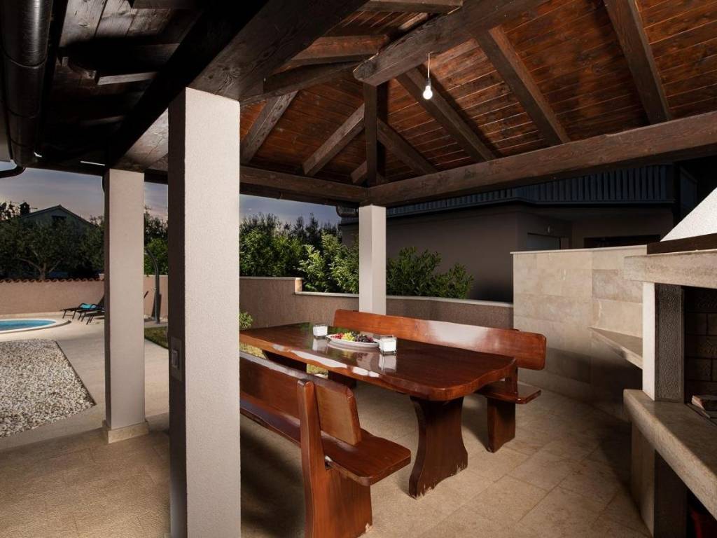 U ponudi imamo ovu lijepu kuću za odmor sa bazenom koja se nalazi nedaleko Pule na mirnoj lokaciji. Kuća se nalazi na zemljištu od 424 m2, te se sastoji od 2 etaže. Na prizemlju se nalazi natkrivena ulazna terasa, hodnik, dnevni boravak s kuhinjom i blagovaonom s izlazom na terasu i dvorište, špajza i wc, unutrašnje stepenište vodi nas na 1. kat gdje se nalaze 3 spavaće sobe i 2 kupatila. Master spavaća soba ima svoje kupatilo i izlaz na veliku terasu. Za parking na raspolaganju su dva parkirna mjesta plus garaža. Za pohranu raznih stvari imamo na raspolaganju vanjsko spremište. Ručanje na otvorenom moguće je na natkrivenom dijelu s kaminom i sjedećom garniturom. Za opuštanje i uživanje tu je i bazen (9x3,8) s vanjskim tušem. Nekretnina se prodaje kompletno opremljena sa uhodanim poslom najma. Vlasništvo 1/1, dokumentacija uredna.