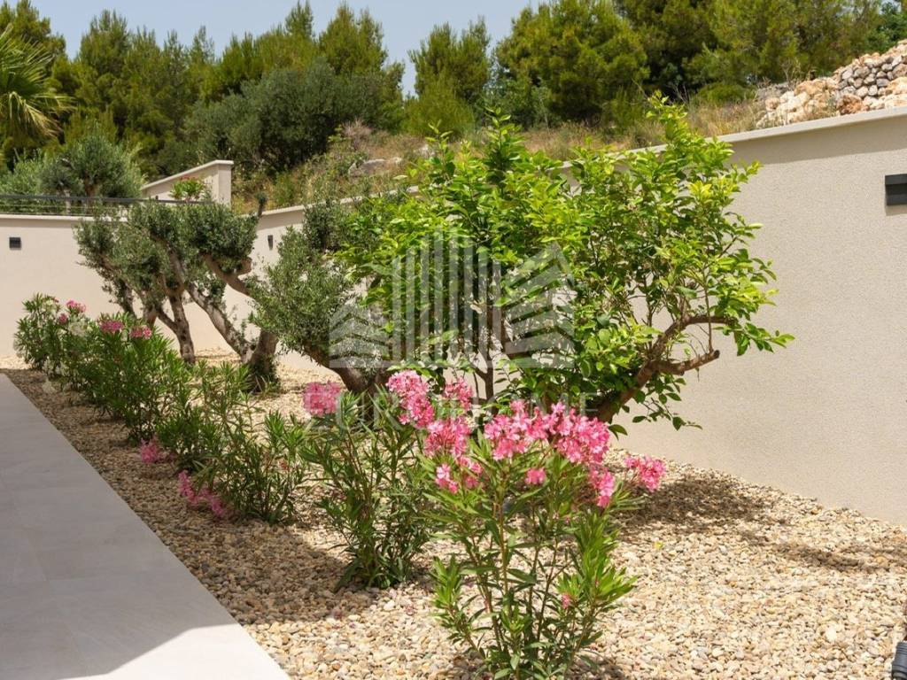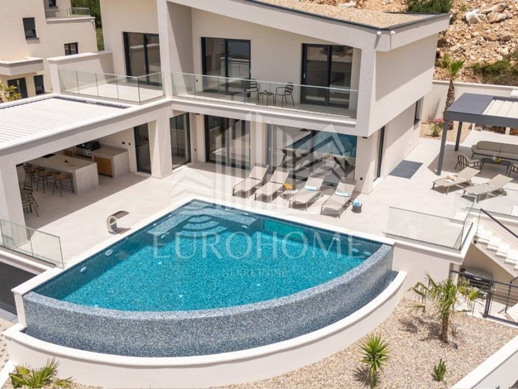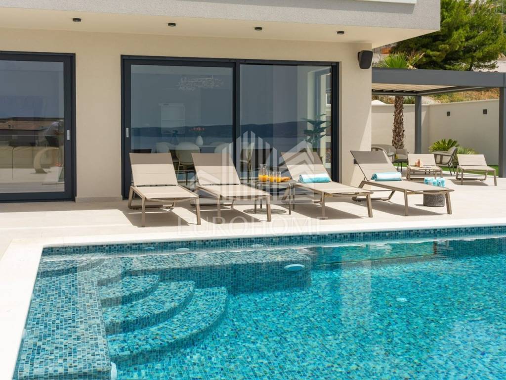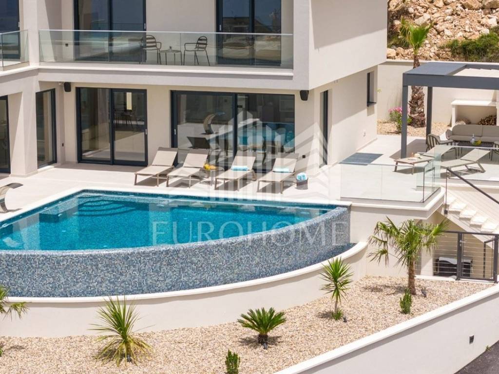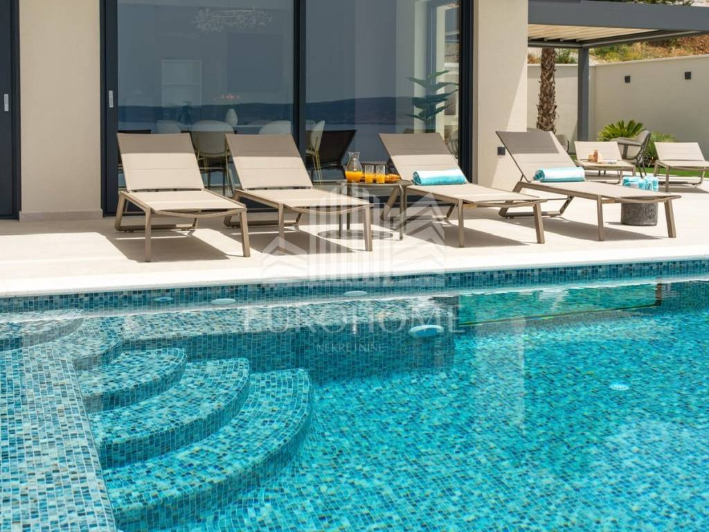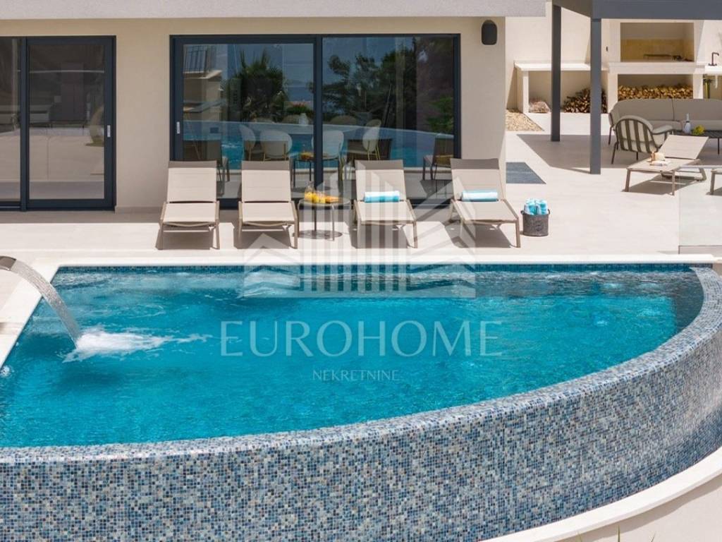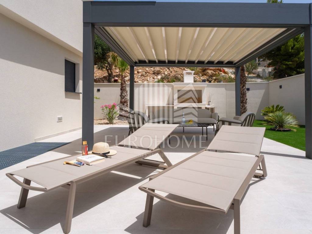 Bioklimatska pergola na terasi pruža dodatnu razinu komfora, dok vanjska kuhinja s plinskim roštiljem omogućuje uživanje u pripremi obroka na otvorenom. S terase se pruža očaravajući pogled na more, koji dodatno naglašava ekskluzivnost ove vile.