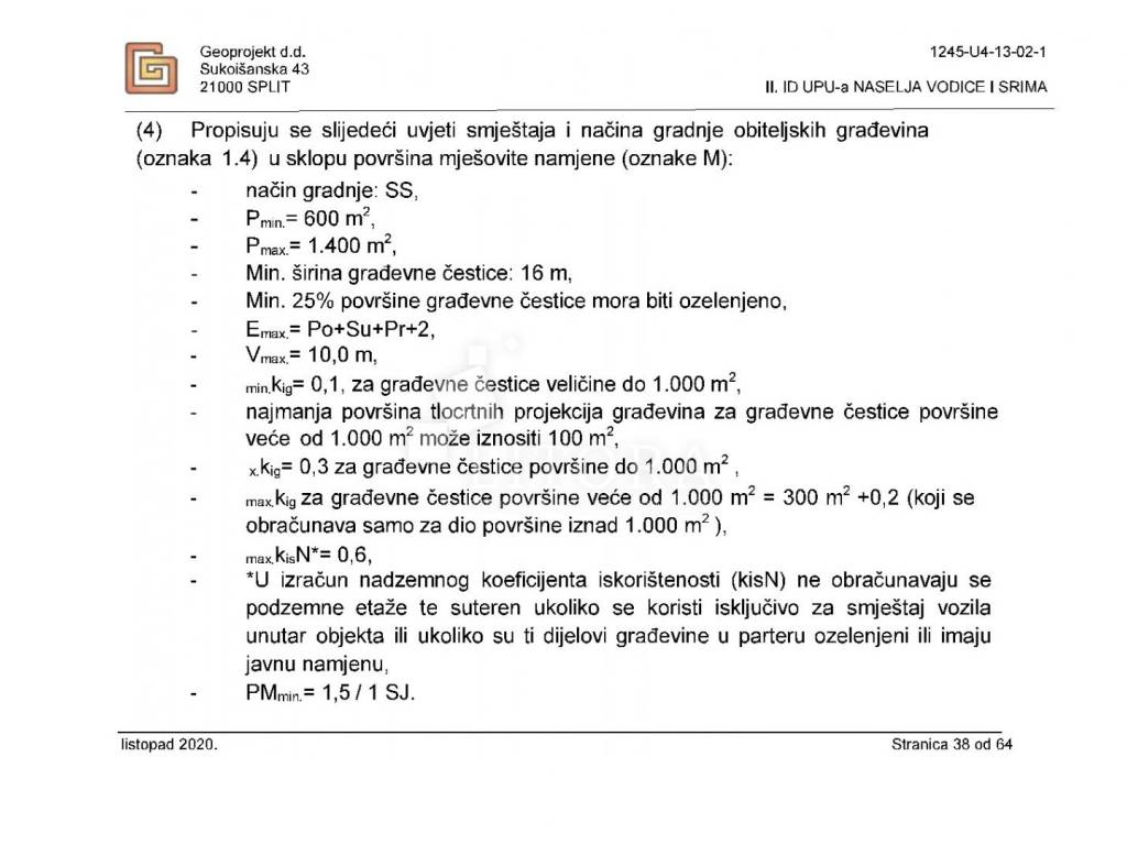 Vodice, mirno okruženje, lokacija koja nudi pogled na more, građevinsko zemljište površine 649m2; Prema urbanističkom planu grada Vodica, zemljište je smješteno u zoni M – 1.4. Parcela je pravilnog pravokutnog oblika dimenzije 22m širine uz prilazni put, i 31m dužine. Na zemljištu je zasađeno nekoliko mladih maslina, a isto je većim dijelom ograđeno dijelom suhozidom. Zemljište ima ucrtan javni prilazni put. Kompletna infrastruktura se nalazi na udaljenosti od 180m. Udaljenost do mora je 1.800 m, a do centra 1.500 m. MOGUĆNOST GRADNJE: Obiteljske građevine sa 4 stambene jedinice * Min. 600 m2 površine; * Etažnost max.= Po+Su+Pr+2; * Visina max.= 10,0 m; * Min. 25% površine građevne čestice mora biti ozelenjeno; * Min. širina 16 m, za građevne čestice za slobodno stojeći način gradnje: * Max. Kig / koeficijent izgrađenosti = 0,3 * Max. Kis / koeficijent iskoristivost nadzemnih etaža = 0,6 (moguća sveukupna površina 389m2); * Max. broj stambenih jedinca = 4 Stana * Parkirna mjesta po 1 stambenoj jedinici min.= 1,5 / 1 Stambena jedinica.