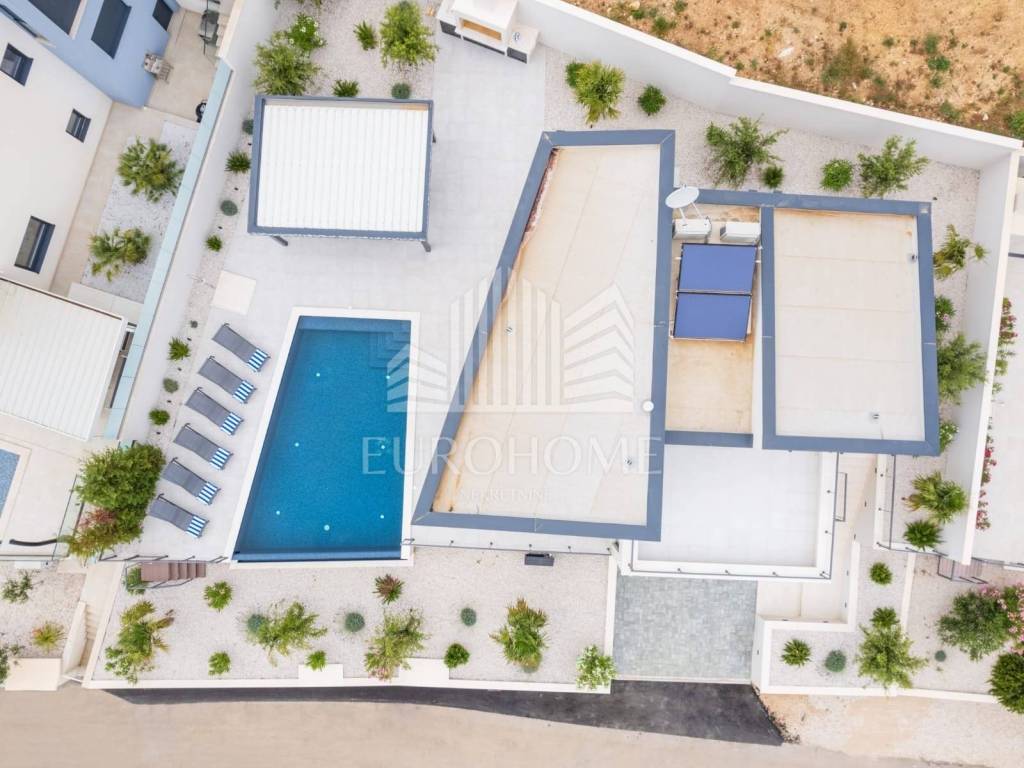 Vila ukupne bruto površine 306 m² (neto 240 m²) nalazi se na uređenoj parceli veličine 605 m². Prostire se na tri etaže – suteren, prizemlje, međukat i prvi kat – te uključuje garažu, veliki vanjski bazen, sunčalište, uređeni vrt i više terasa.