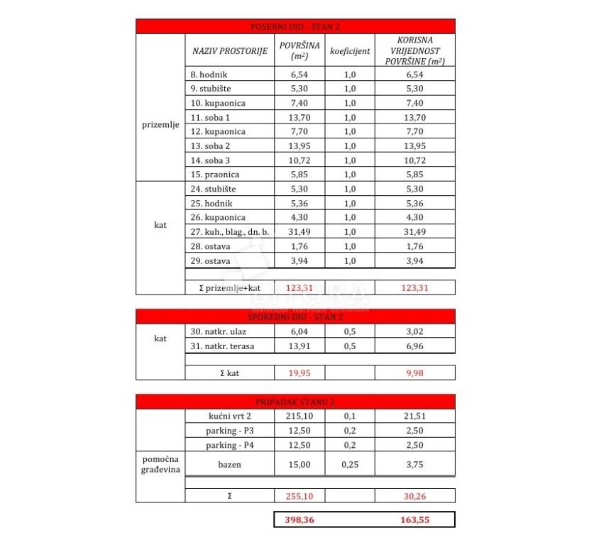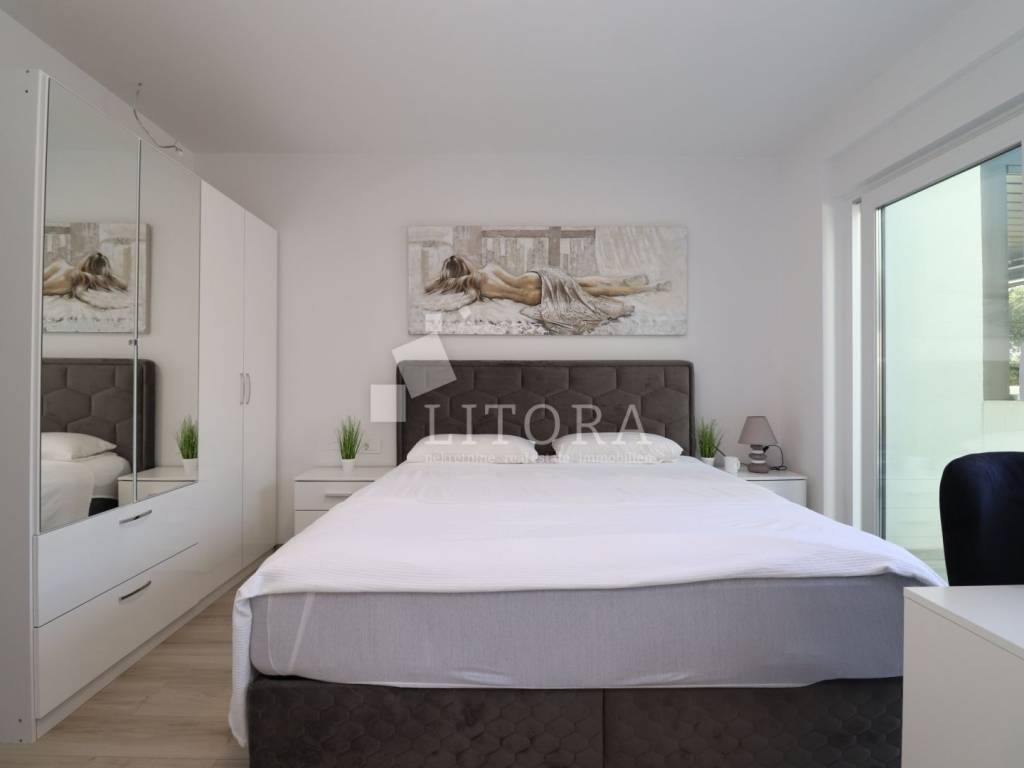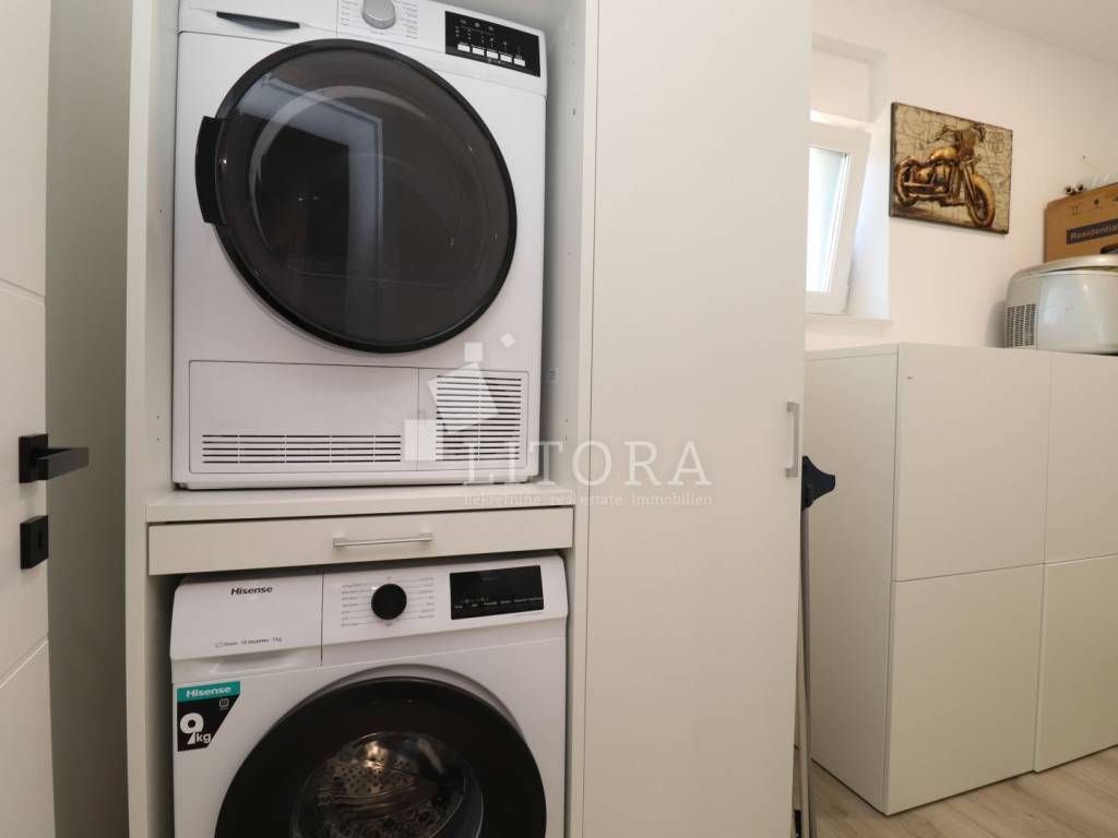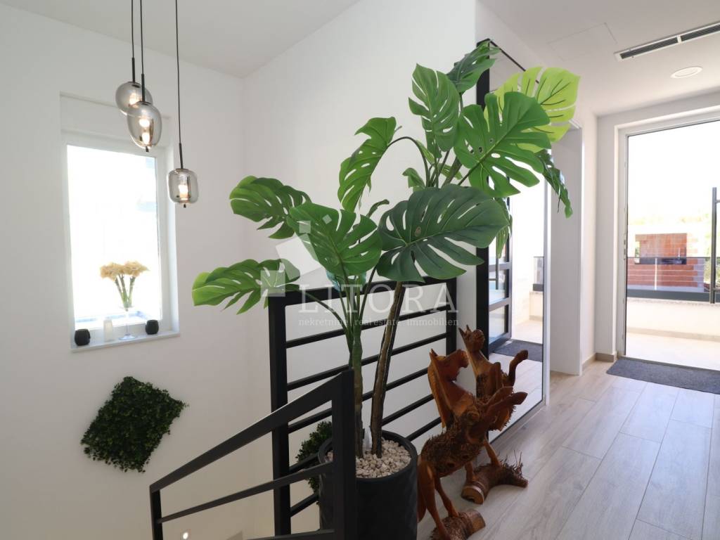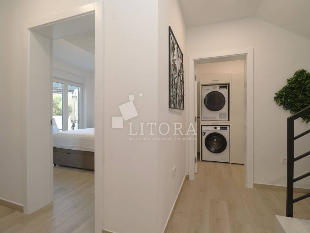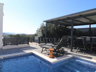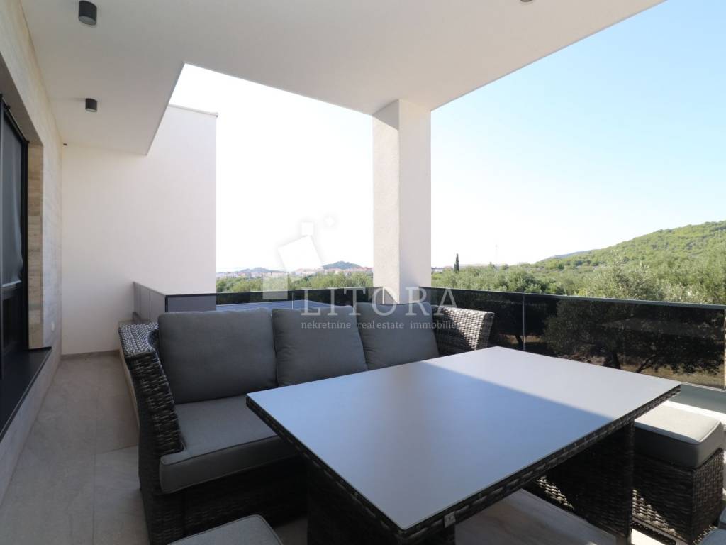 Vodice – novogradnja, namještena obiteljska kuća s bazenom i pogledom na more. Moderno uređena, namještena obiteljska kuća s bazenom, smještena na mirnoj lokaciji u Vodicama, s prekrasnim pogledom na more. Kuća je dio dvojnog objekta i prostire se na dvije etaže (prizemlje + prvi kat), s ukupno 163,55 m² korisne površine, uređenim vrtom površine 240,10 m², bazenom od 15 m² te dvama parkirnim mjestima. U prizemlju se nalaze hodnik, kupaonica, ostava/praonica, tri spavaće sobe, od kojih jedna ima vlastitu kupaonicu. Sve spavaće sobe imaju izlaz na terasu i dvorište. Unutarnjim stubištem dolazi se na prvi kat, gdje se nalaze ostava, hodnik, kupaonica te prostrani dnevni boravak s kuhinjom i blagovaonicom koji imaju izlaz na terasu s pogledom na more. Glavni ulaz u kuću nalazi se na prvom katu, gdje je i parkirni prostor. U razini prvog kata nalazi se popločano dvorište sa sunčalištem, bazen od 15 m² te zasebna ostava s kotlovnicom. Dvorište je u potpunosti ograđeno. Kuća je opremljena klima-uređajima u svakoj sobi, podnim grijanjem u cijelom prostoru, termo fasadom, aluminijskom stolarijom s komarnicima te roletama s električnim podizačima. Bazen je opremljen osnovnom tehničkom opremom. Kuća je u potpunosti namještena, a namještaj je uključen u cijenu nekretnine. Udaljenost do plaže iznosi 950 m, a do centra mjesta 1.250 m.