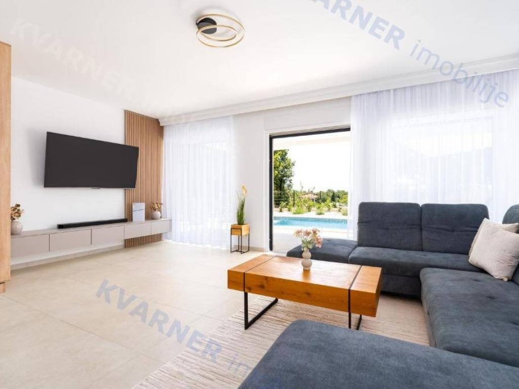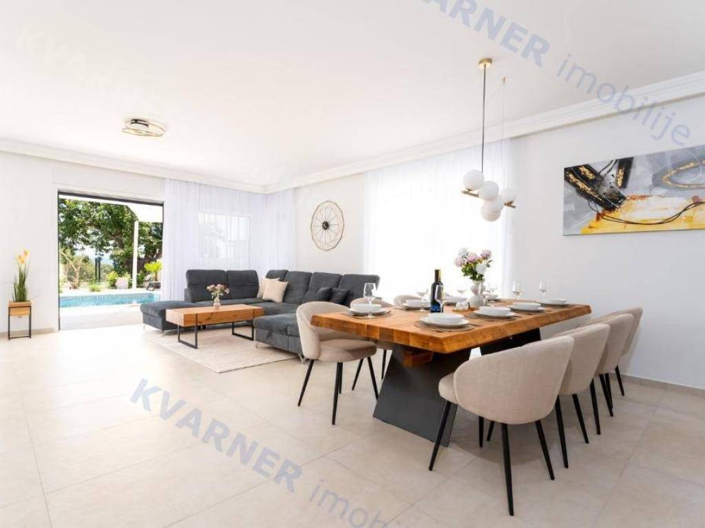 U prizemlju se nalazi prostrana soba za druženje s direktnim izlazom na okućnicu s roštiljem, kupaonica, te open space dnevni prostor koji objedinjuje kuhinju, blagovaonicu i dnevni boravak, s izlazom na terasu i bazen. Unutarnje stepenice vode na kat gdje se nalaze četiri spavaće sobe, svaka s vlastitom kupaonicom i izlazom na balkon.