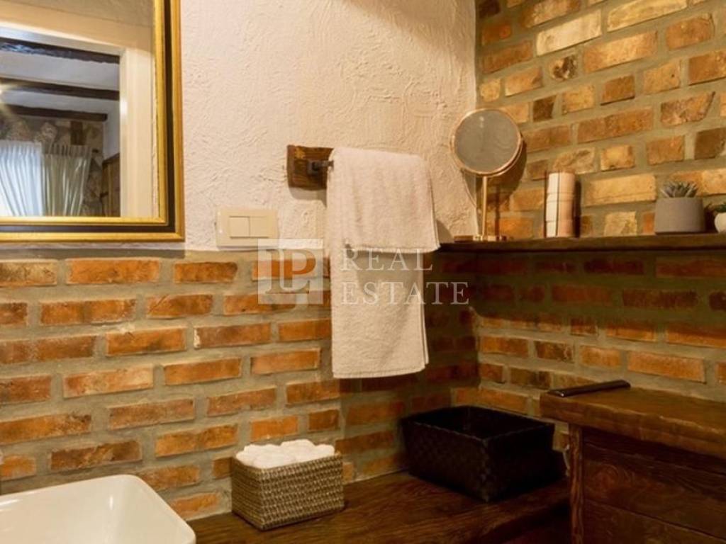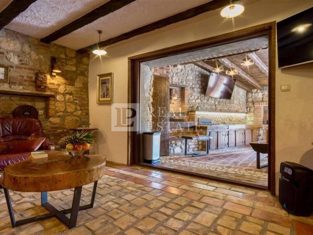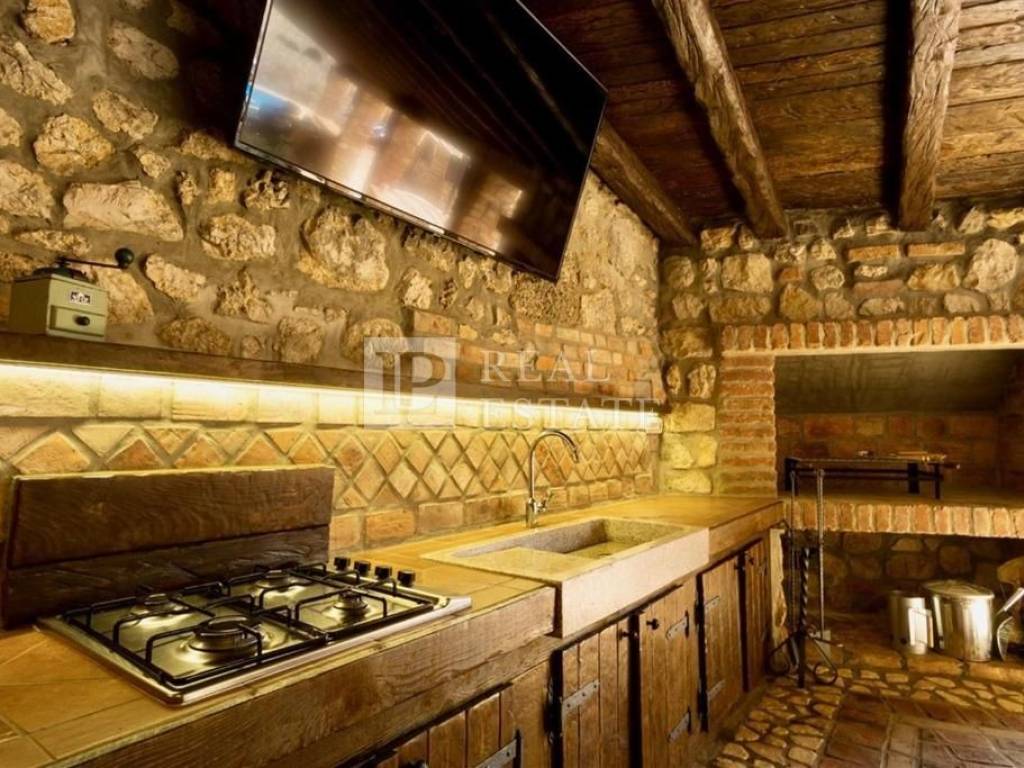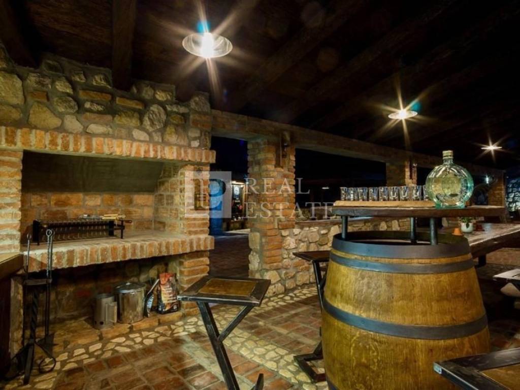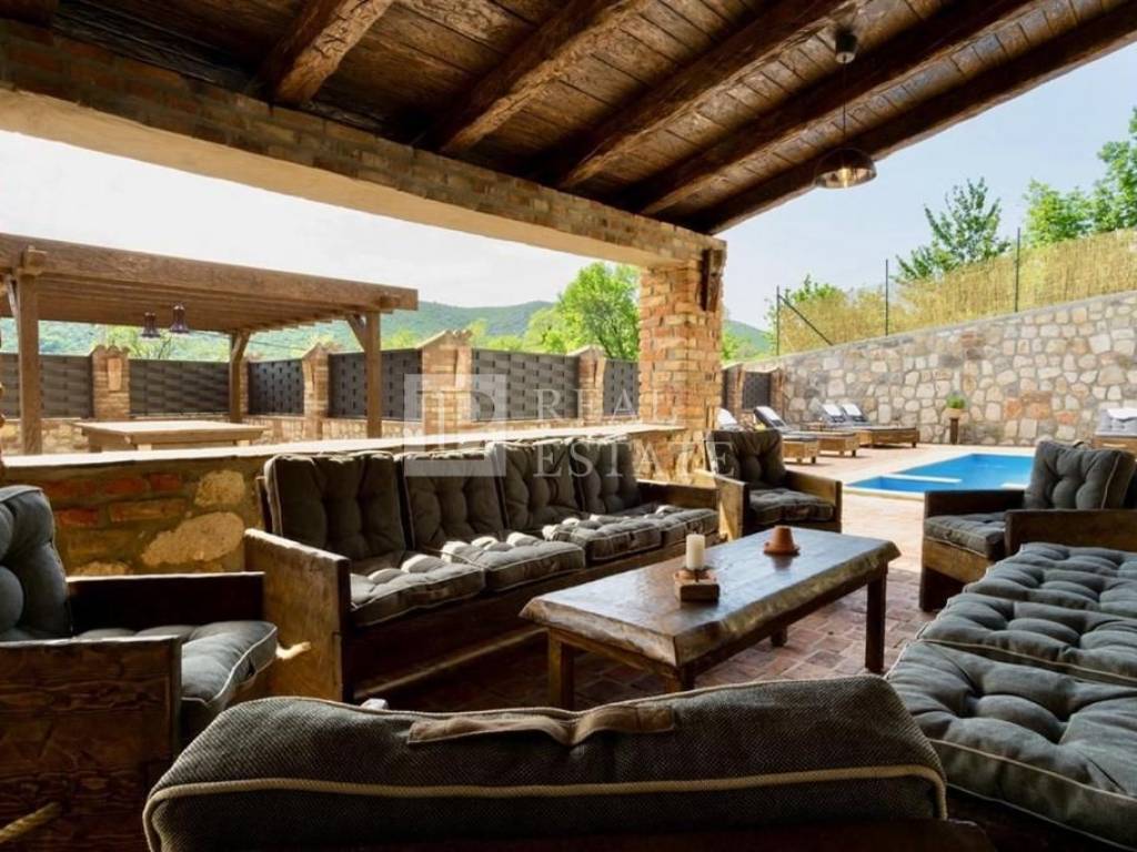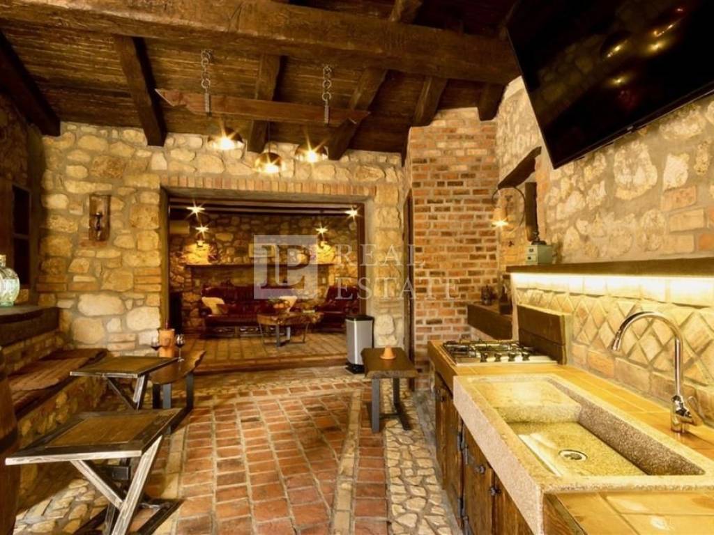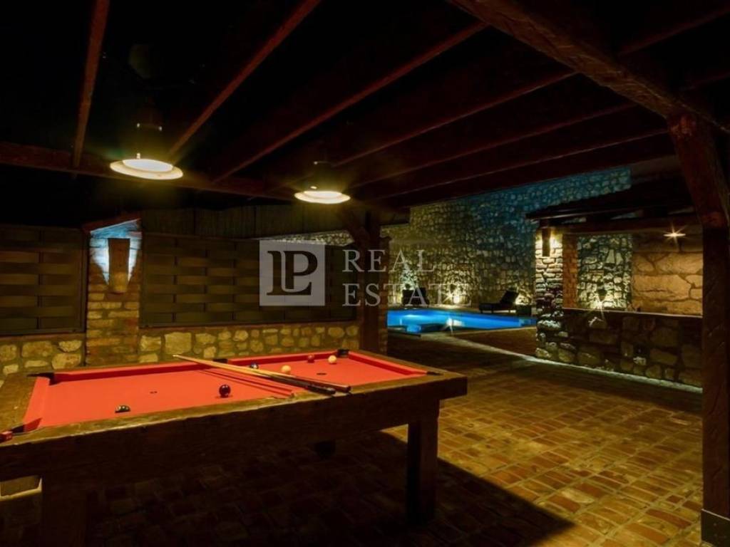Unutar ograđene okućnice smješteni su bazen sa sunčalištem te zanimljiv prostor za druženje sa ručno izrađenim stolom za biljar, pikadom i sličnim sadržajima. Kod uređenja i opremanja kuće pozornost je pridana detaljima pri čemu su korišteni izuzetno kvalitetni materijali u kombinaciji kamena i drva.