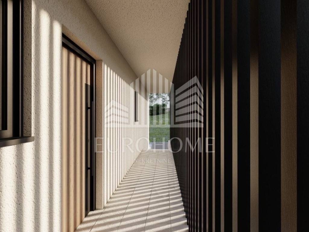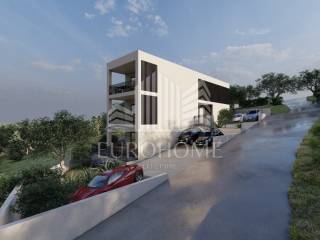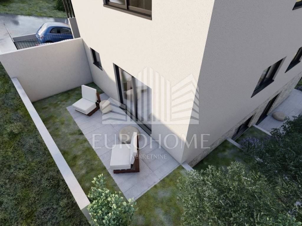 Vanjski dio prizemnog stana obložen je prirodnim bijelim kamenom, što dodatno naglašava osjećaj luksuza.