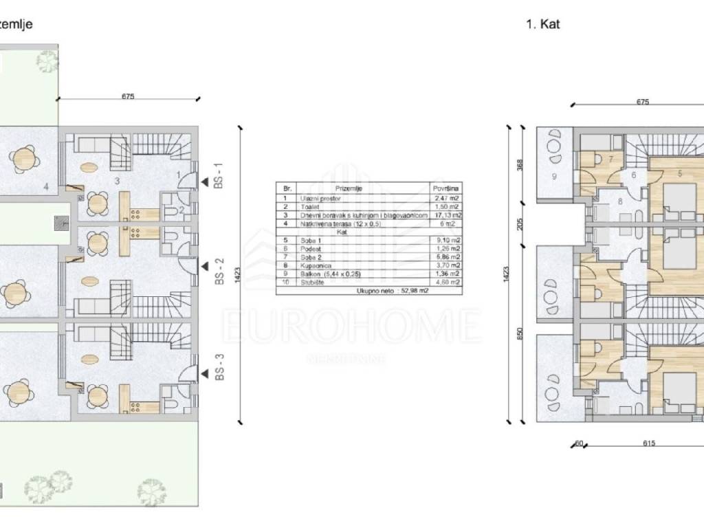 Stan se sastoji od prizemlja i kata, s pripadajućim dvorištem, natkrivenom terasom u prizemlju i balkonom na katu. U cijenu su uključena dva privatna parkirna mjesta te vlastiti biopročistač.